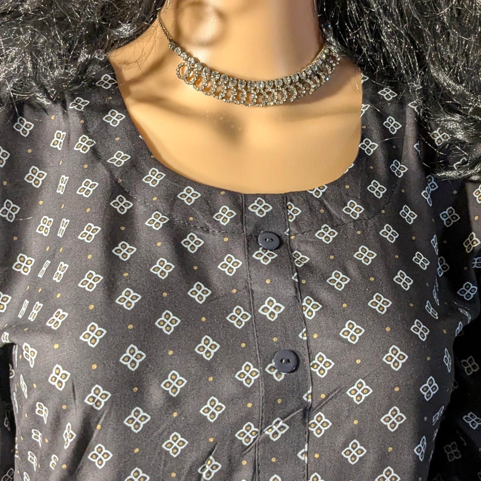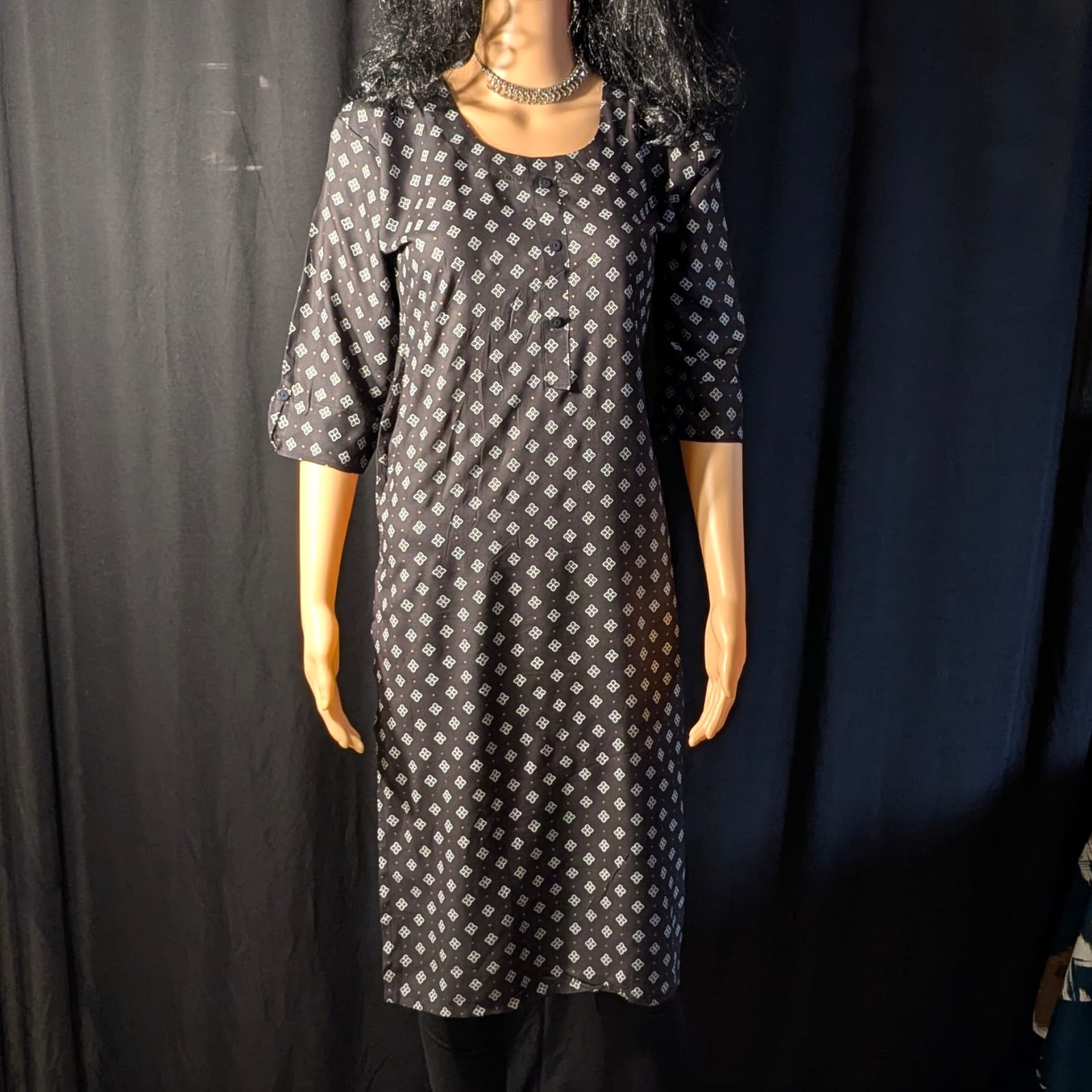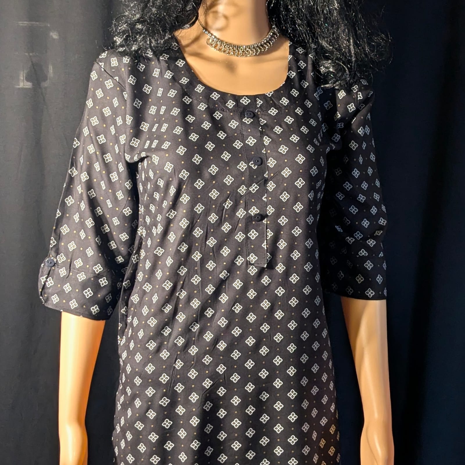 Enhanced with elegant printed patterns, this kurti adds subtle charm to the classic black shade. A functional side pocket provides added convenience for carrying small essentials without compromising style. Finished with 3/4th sleeves, this kurti ensures comfort and season-friendly wear. Style it effortlessly with leggings, straight pants, or palazzos for a refined ethnic ensemble.