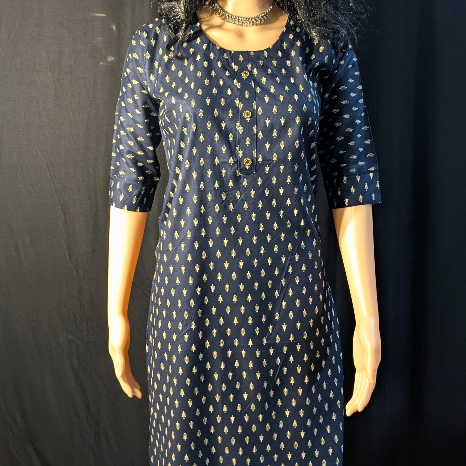 Highlighted with beautiful tree prints, the kurti brings a touch of traditional charm and natural inspiration to its overall look. The 3/4th sleeves provide comfort and a polished finish, making it ideal for long hours of wear. Pair it effortlessly with leggings, straight pants, or palazzos for a graceful and refined ethnic ensemble.
