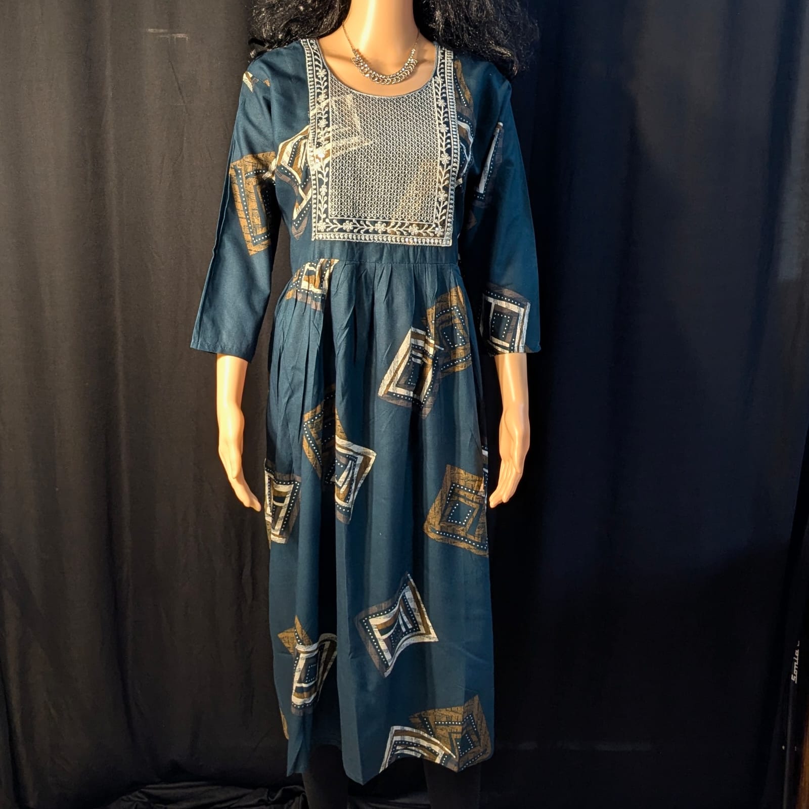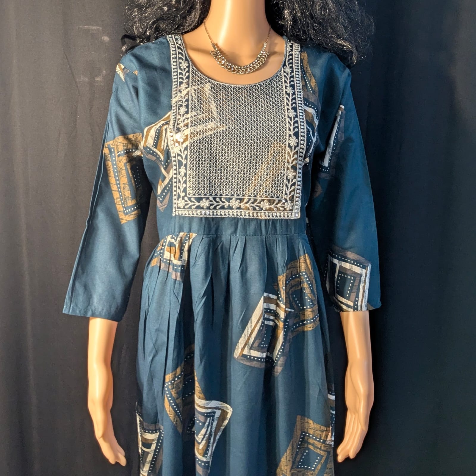 Add a touch of fun and elegance to your ethnic collection with this dark green umbrella kurti, featuring charming white mango print designs. Crafted from soft, breathable fabric, this kurti offers a beautifully flared umbrella silhouette that drapes gracefully and allows easy movement. The simple neck design keeps the look clean and versatile, making it ideal for office wear, casual outings, or daily use.