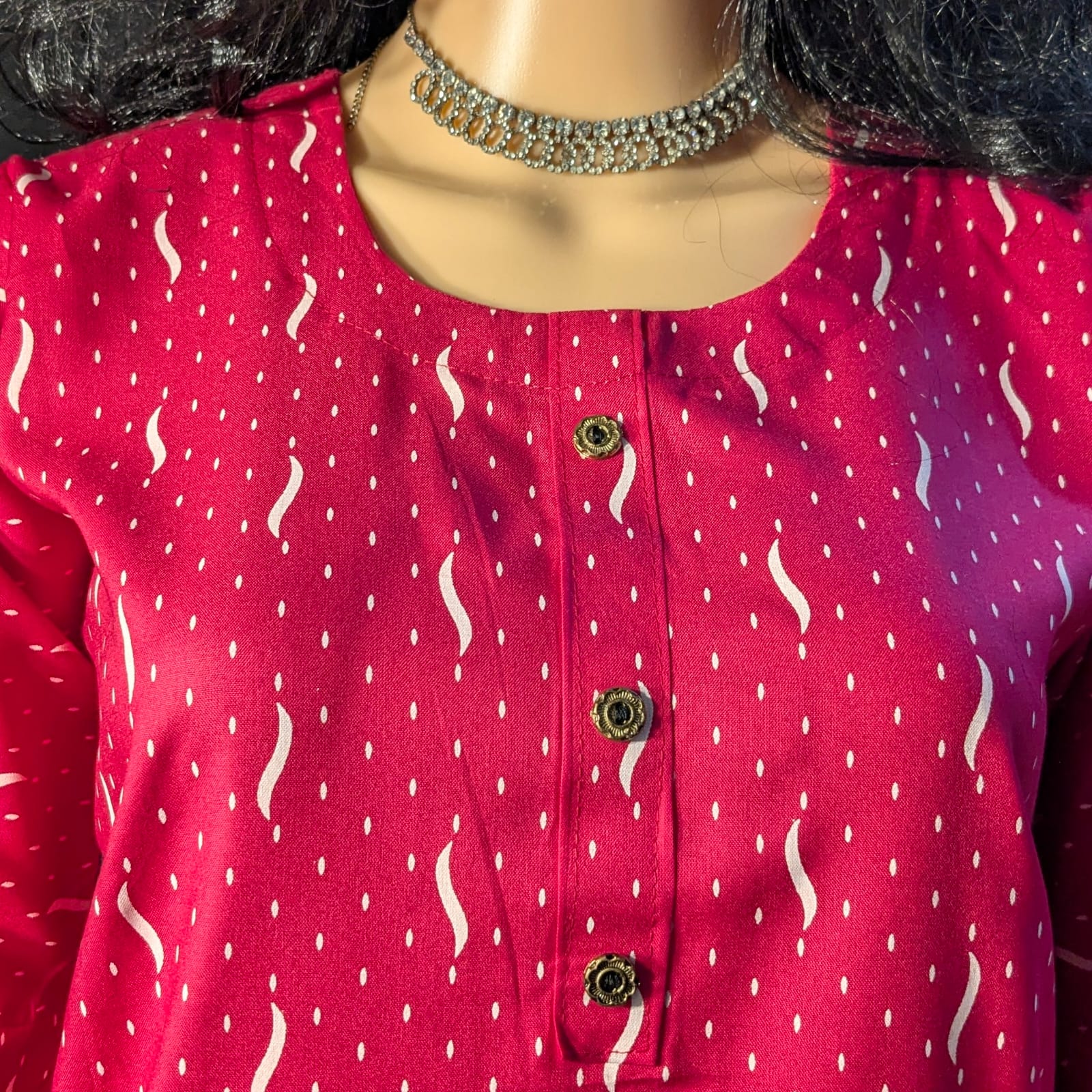 Add a touch of elegance to your wardrobe with this beautifully crafted dark pink straight-cut kurti, designed for women who love comfort with style. The kurti features a refined button-neck pattern that enhances the neckline while maintaining a simple and graceful look. Adorned with delicate white designs across the fabric, it brings a soft contrast that elevates the overall appearance.