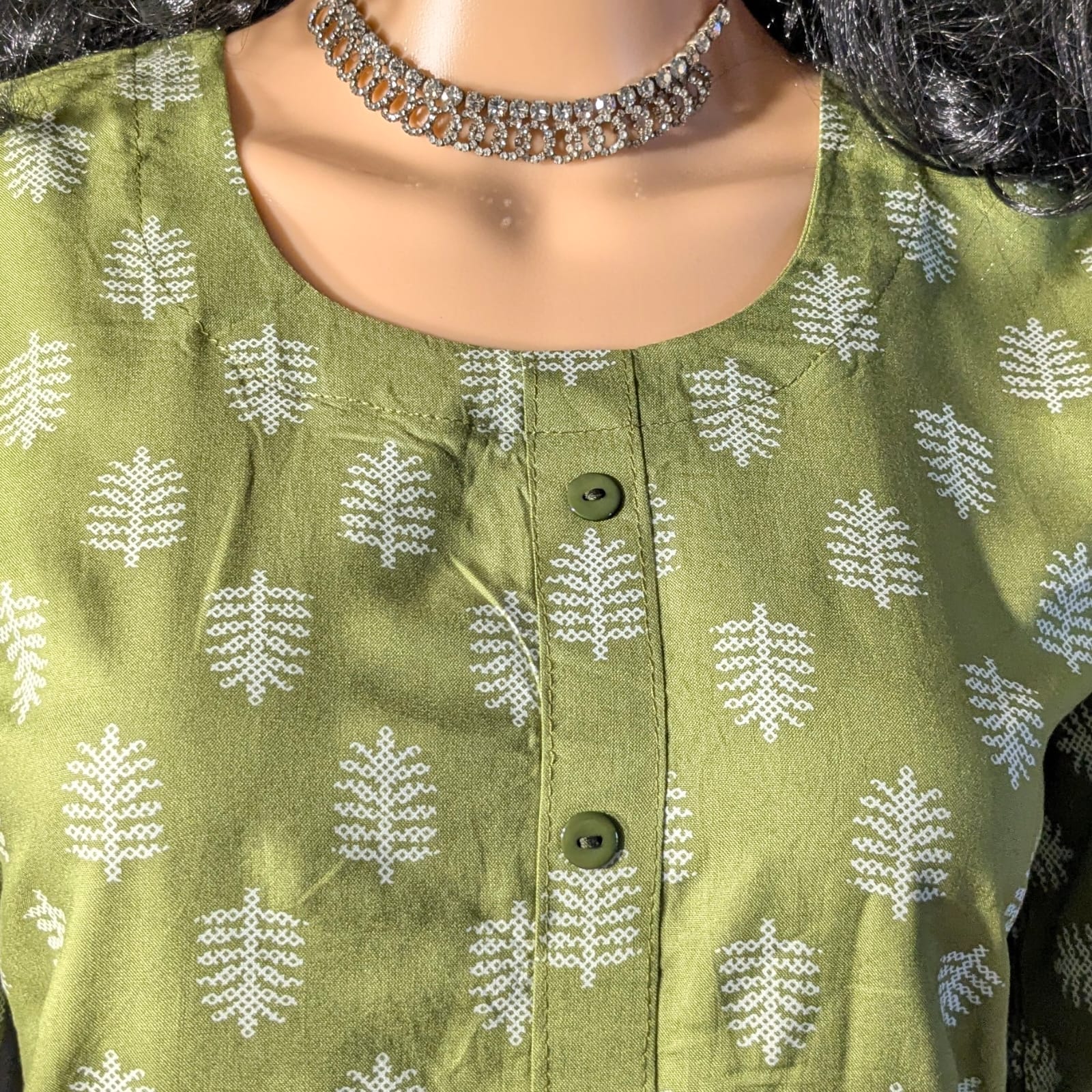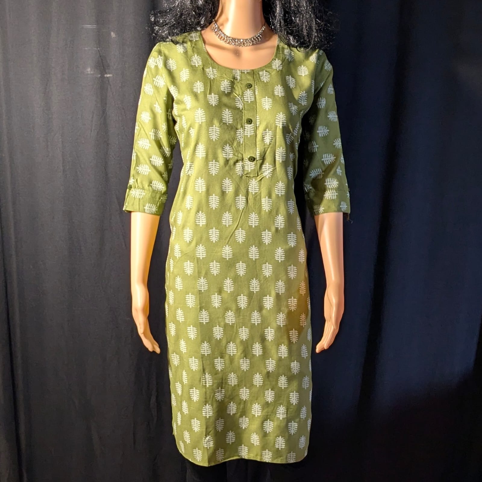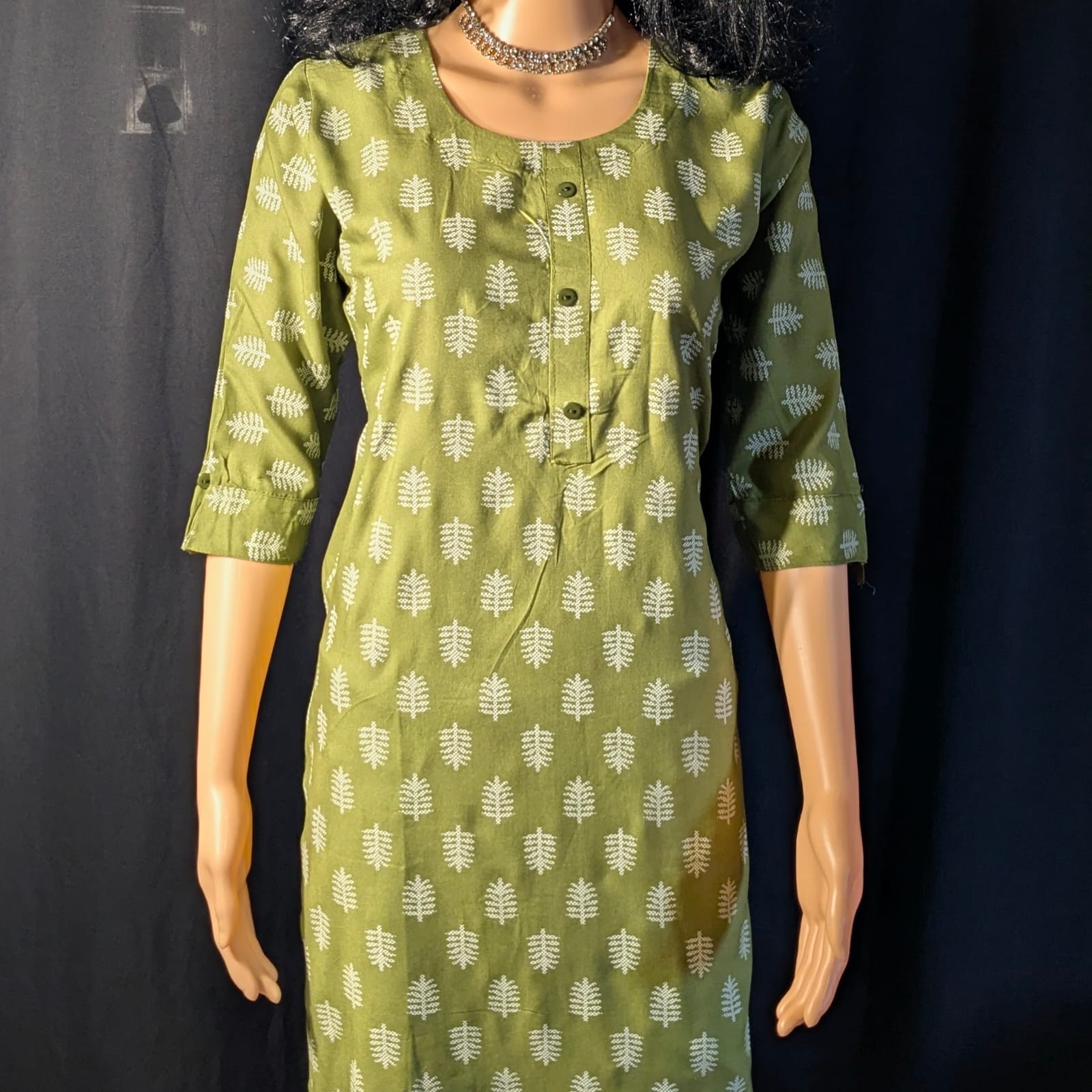 Adorned with delicate printed patterns, this kurti adds subtle charm to the rich green shade. A functional side pocket provides practicality, allowing you to carry small essentials effortlessly. Finished with 3/4th sleeves, it ensures comfort and season-friendly wear. Pair it with leggings, straight pants, or palazzos for a polished and stylish ethnic look.