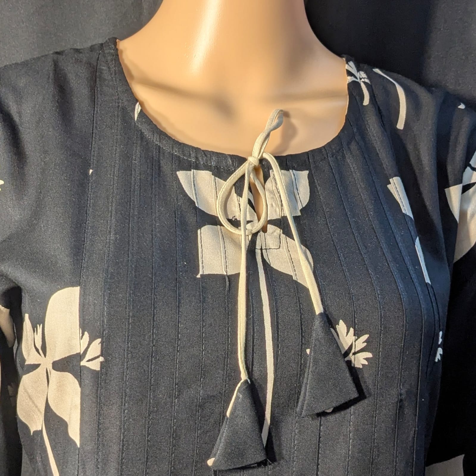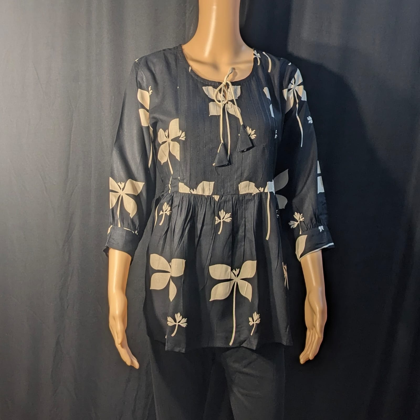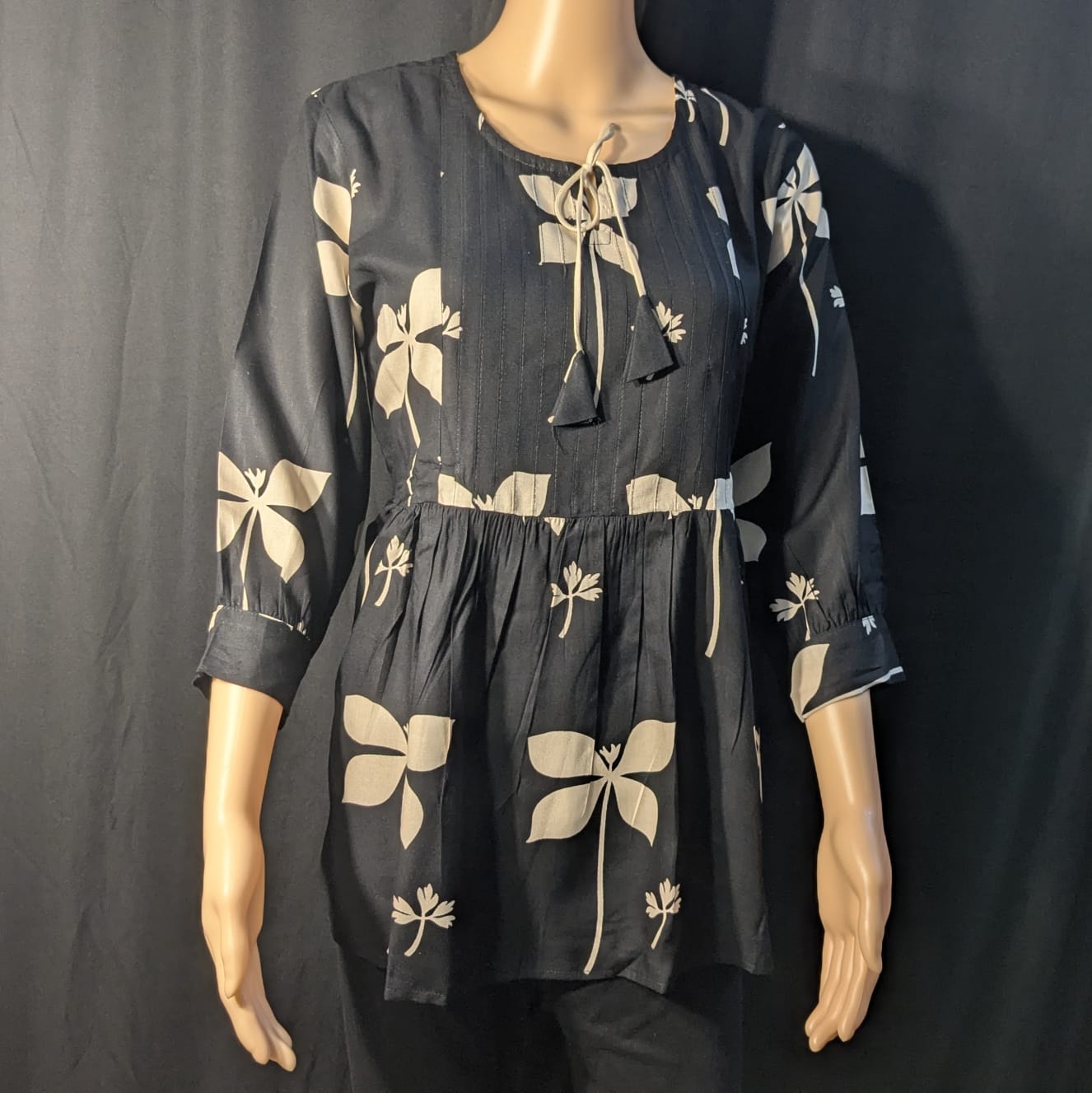 Adorned with subtle cream-coloured designs, this tunic balances simplicity with charm, while the 3/4th sleeves provide both comfort and versatility. Its flattering silhouette ensures ease of movement, making it a practical yet stylish choice. Pair it effortlessly with leggings, palazzos, or jeans for a polished and graceful look.