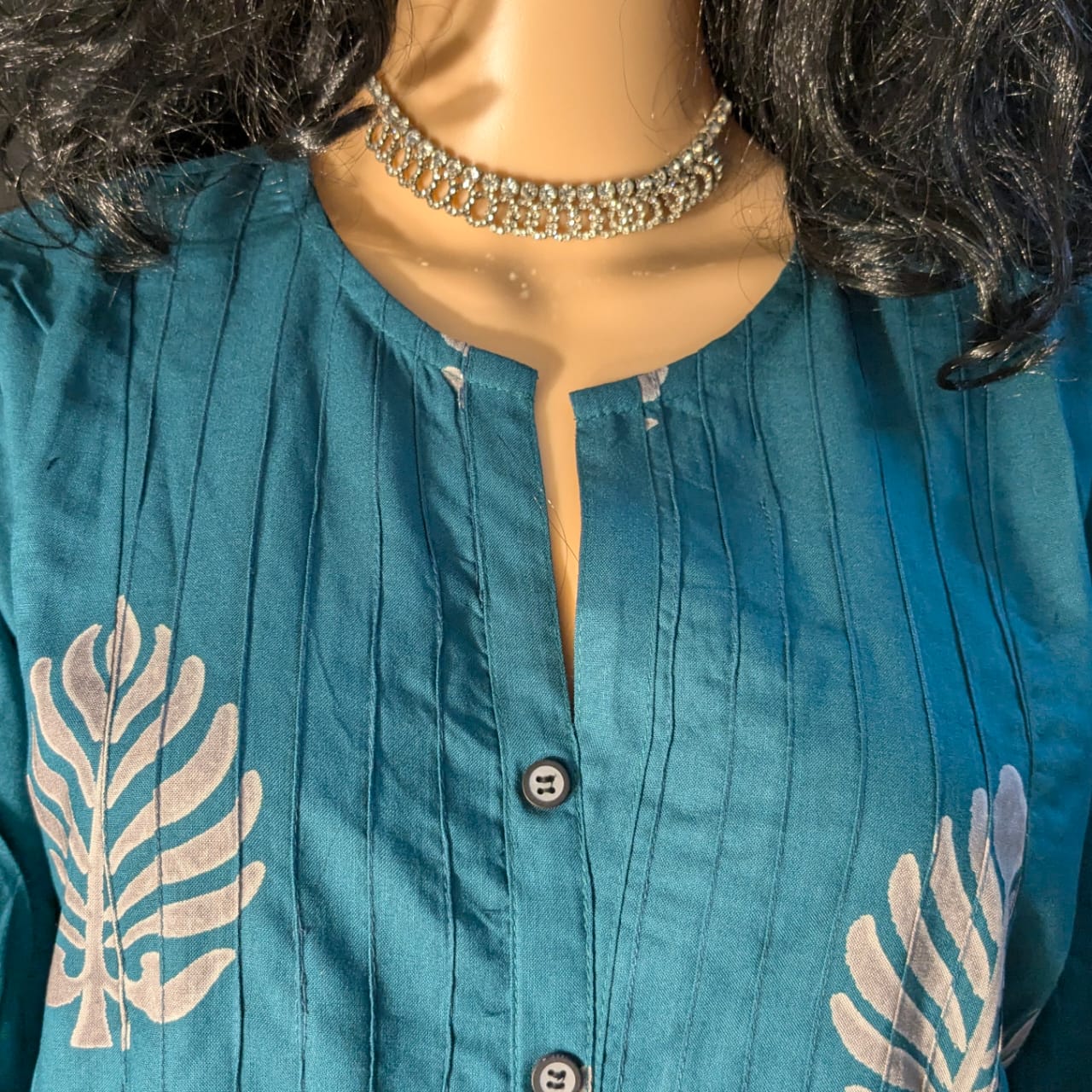Whether you're heading to work, a casual outing, or a festive get-together, this peacock green designer tunic enhances your look with sophistication and charm.