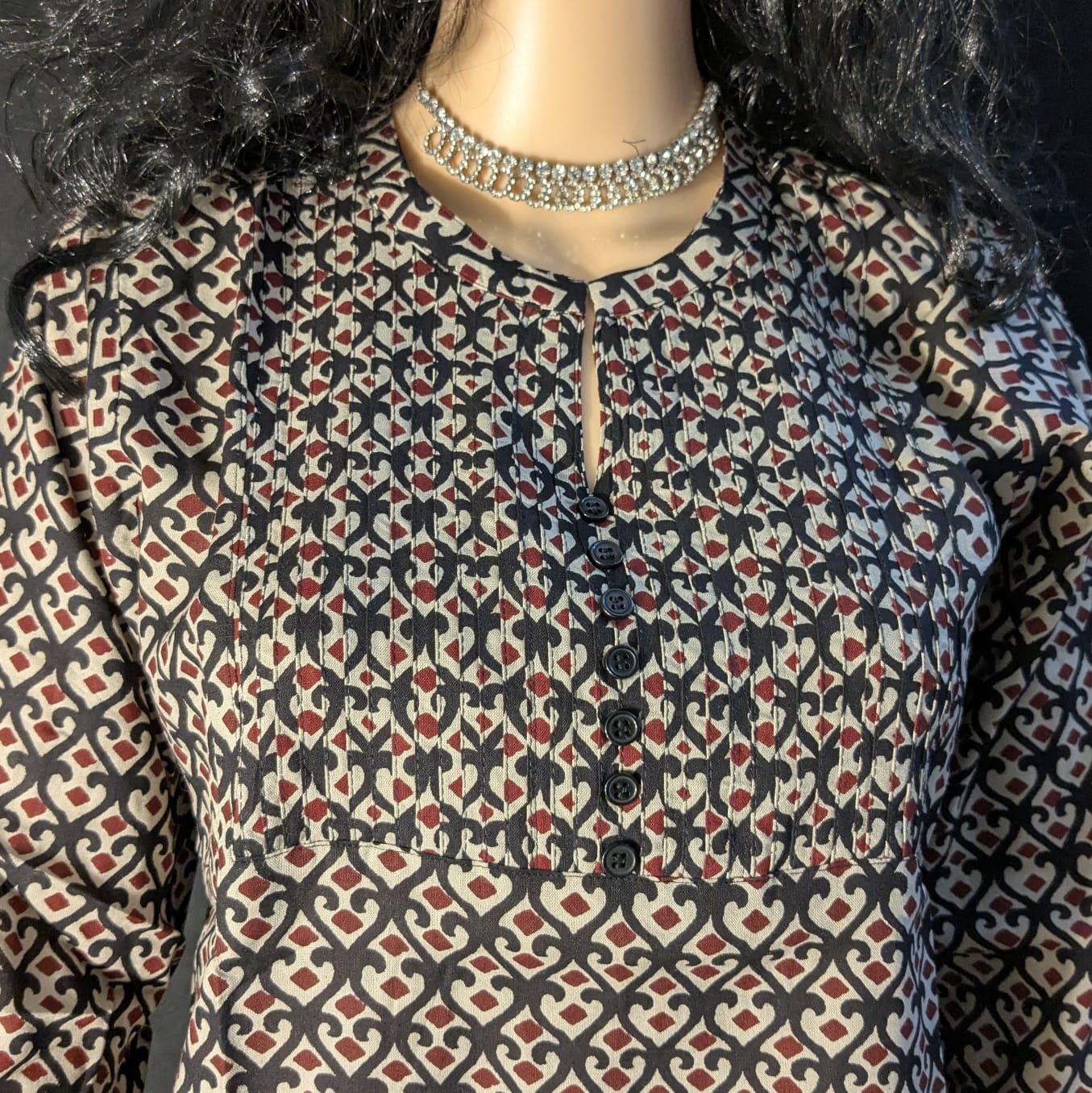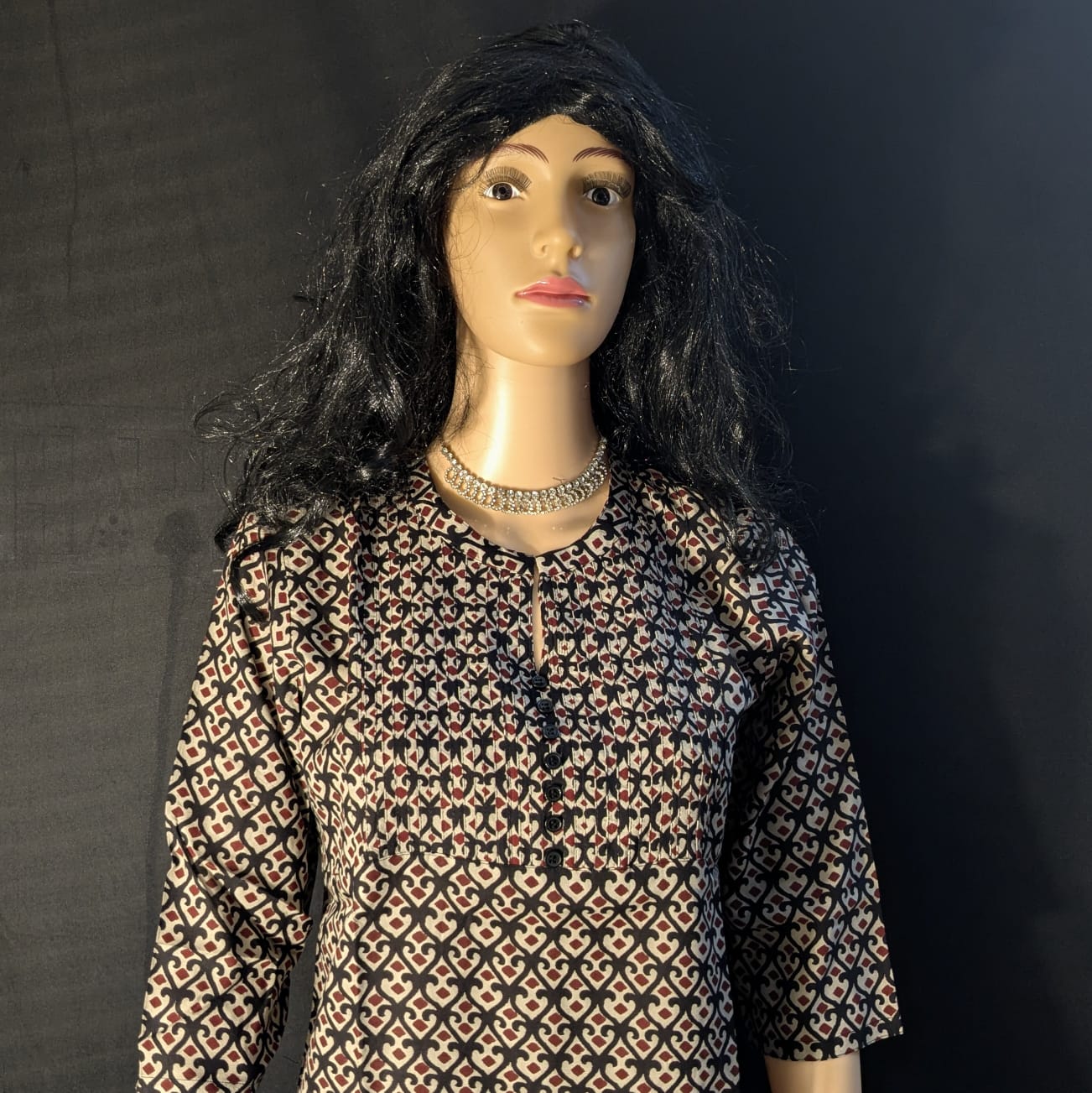 Elevate your everyday wardrobe with this sandal and black mixed short kurti, crafted in a chic tunic-style design that perfectly balances elegance and comfort. The contrasting black accents enhance the sandal base beautifully, giving it a refined and stylish appeal. Designed with a button neck pattern, this kurti adds a modern touch to traditional wear, making it an ideal choice for casual outings, office wear, and daily styling.