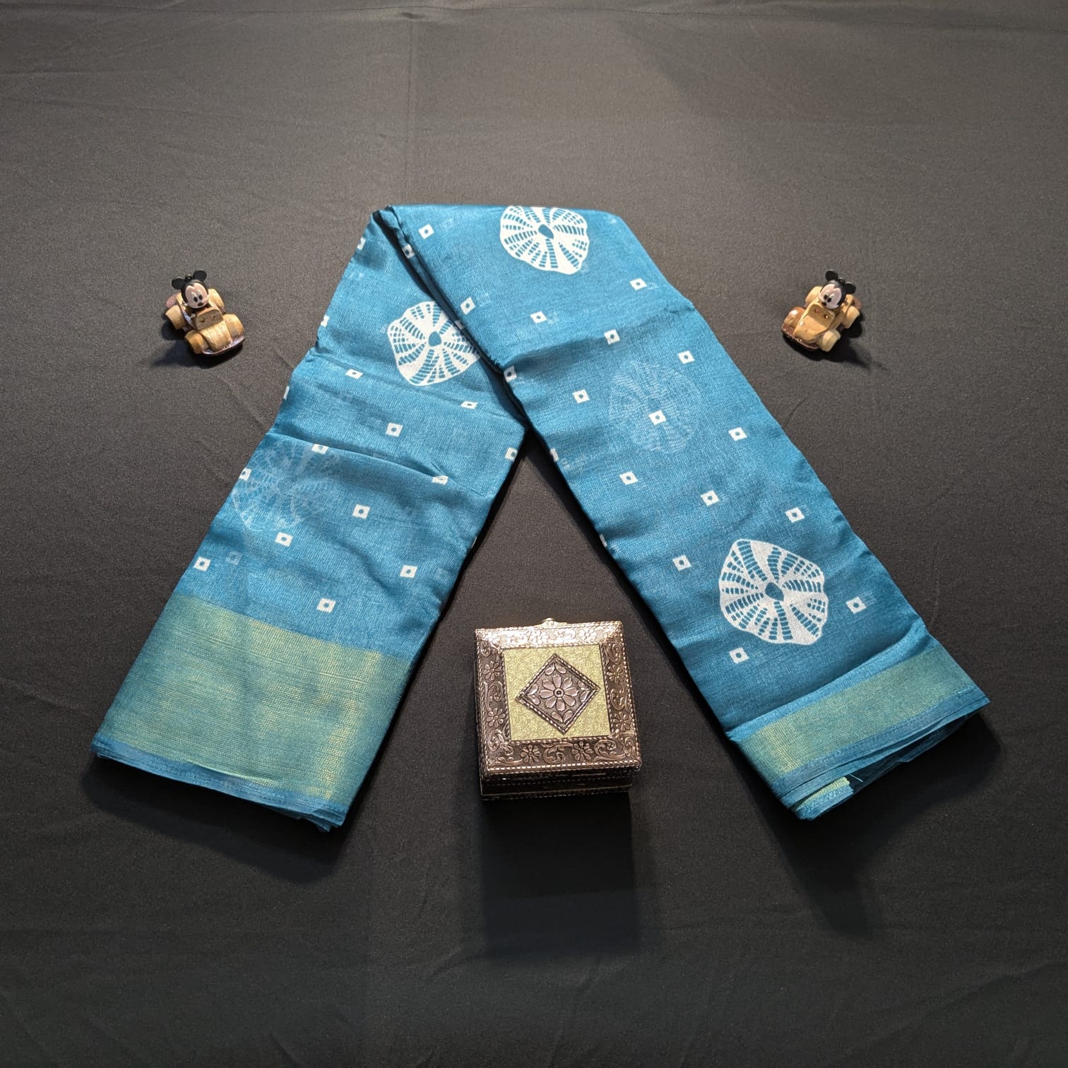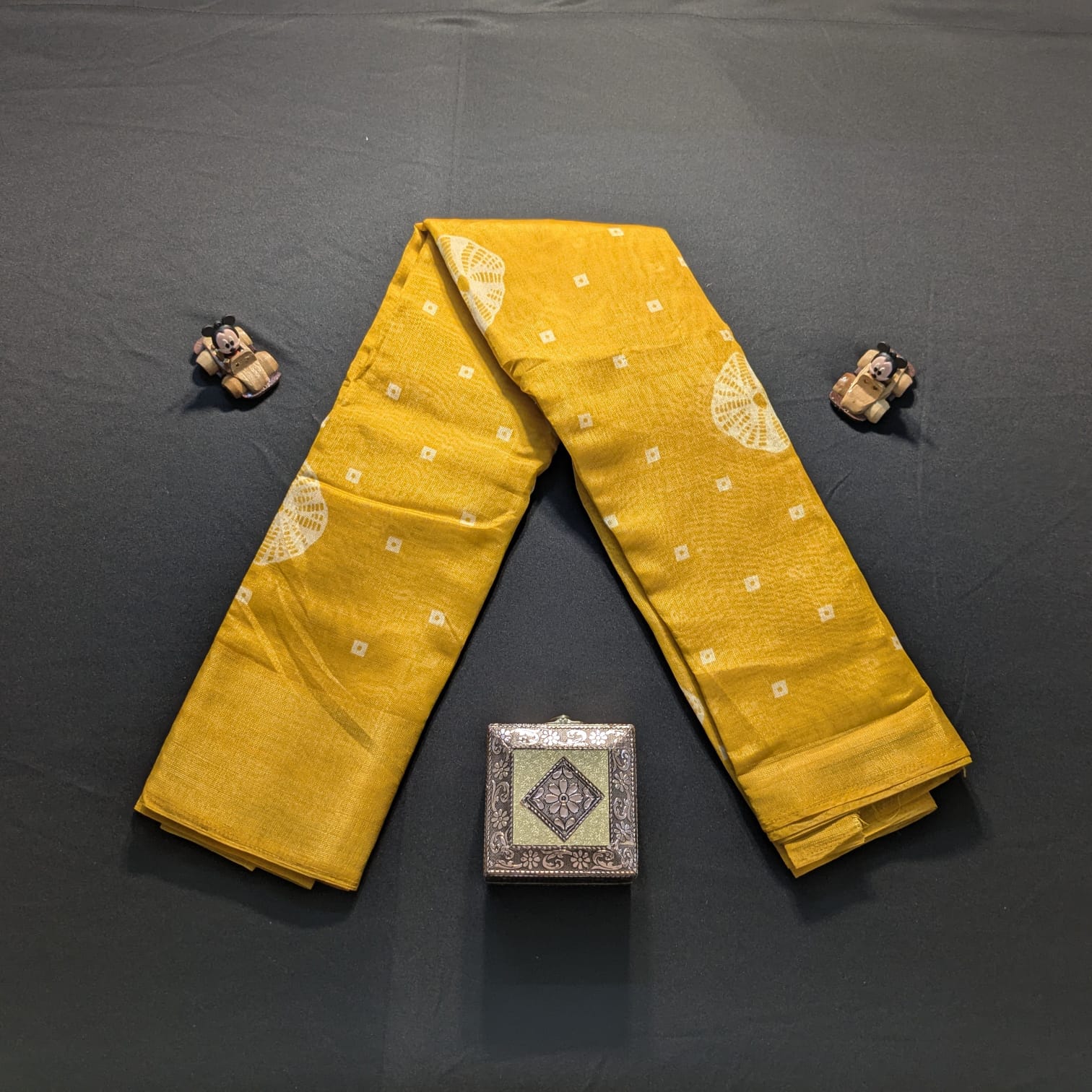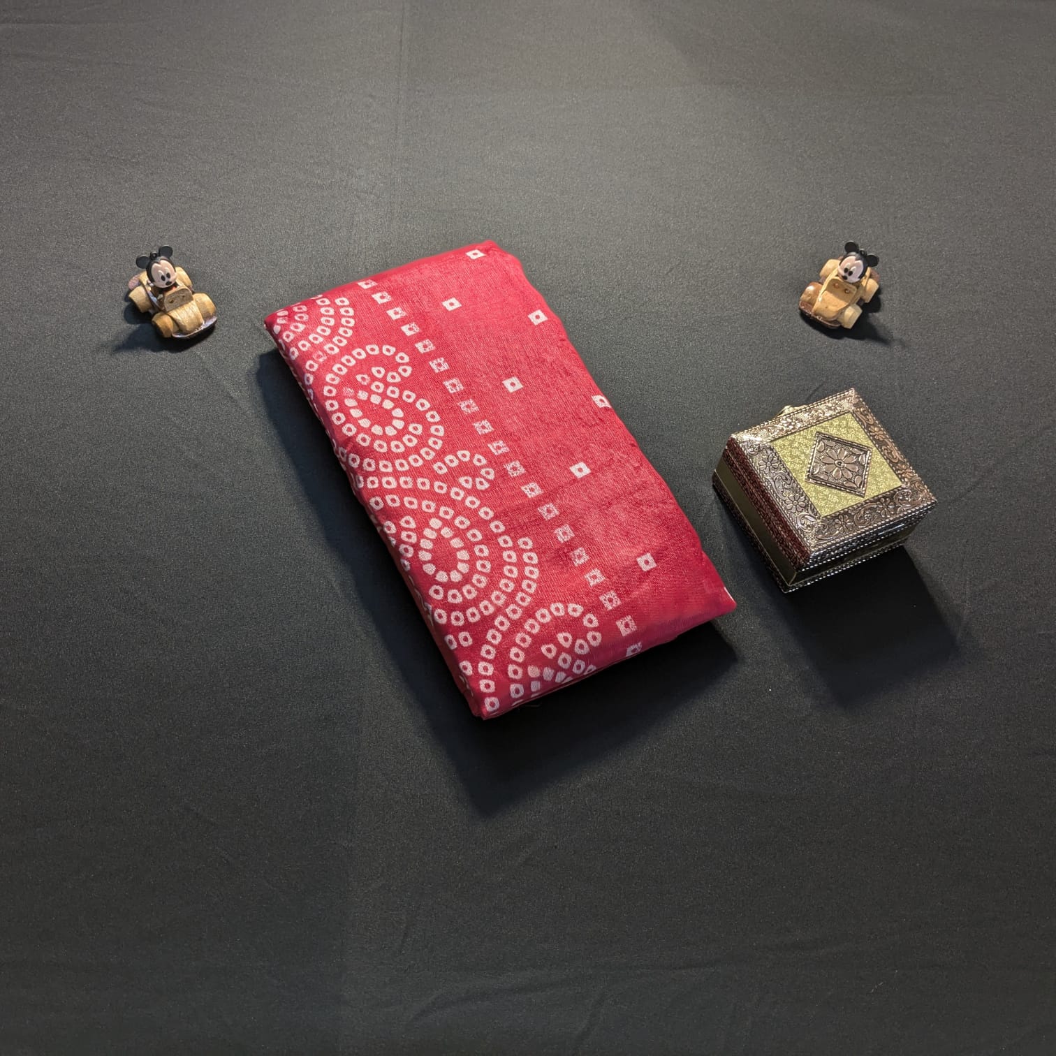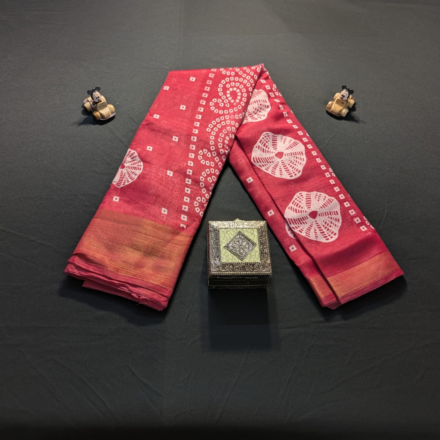 Add a touch of timeless elegance to your wardrobe with this vibrant jute saree, adorned with unique bandhini designs and a luxurious golden border. Crafted from premium quality jute fabric, this saree is lightweight, breathable, and comfortable, making it ideal for office wear, casual outings, and semi-formal occasions.