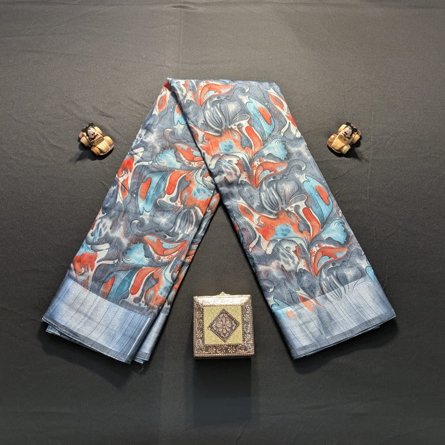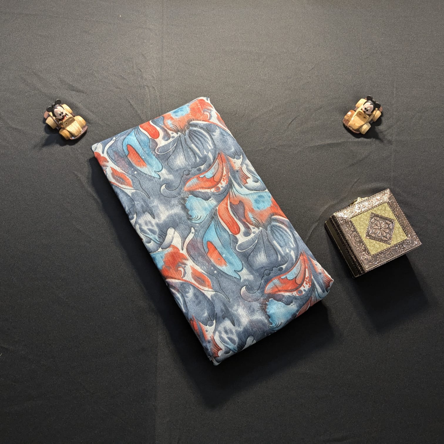 The soothing blue base provides an elegant backdrop, while the red wave prints add a dynamic and eye-catching contrast, giving the saree a contemporary yet graceful appeal. Perfect for casual outings, office wear, and festive gatherings, this saree blends comfort with modern style.