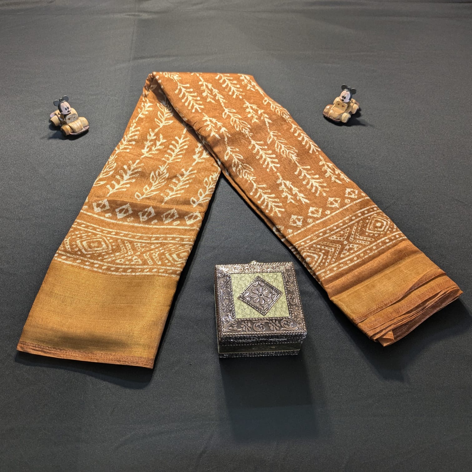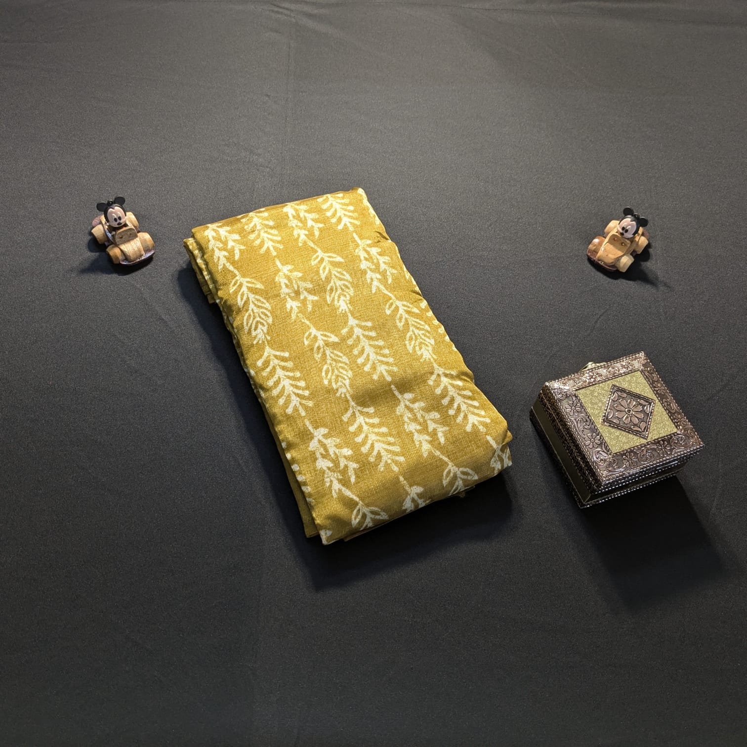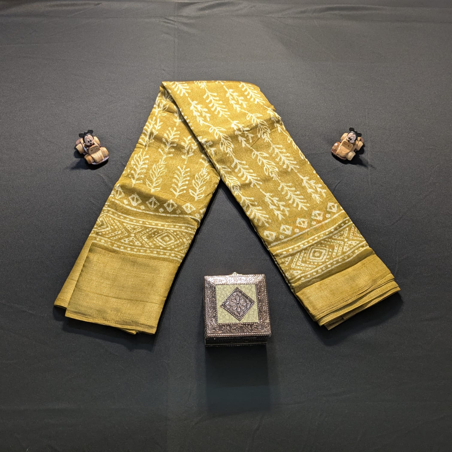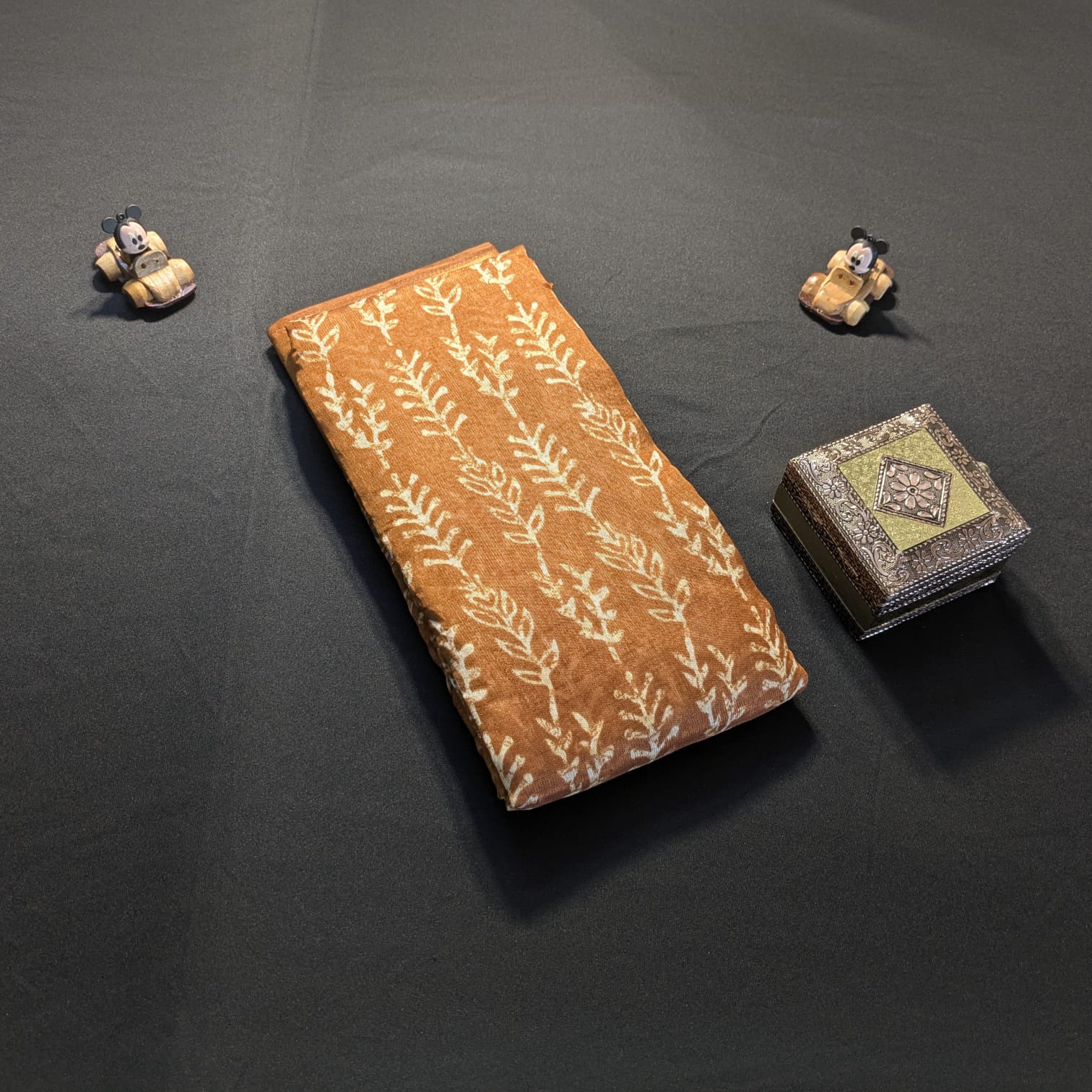 Add a touch of sophistication to your wardrobe with this vibrant jute saree, adorned with unique tree motif designs and a luxurious golden border. Made from premium quality jute fabric, this saree is lightweight, breathable, and comfortable, making it ideal for office wear, casual outings, and semi-formal occasions.