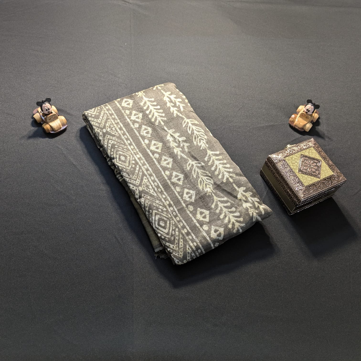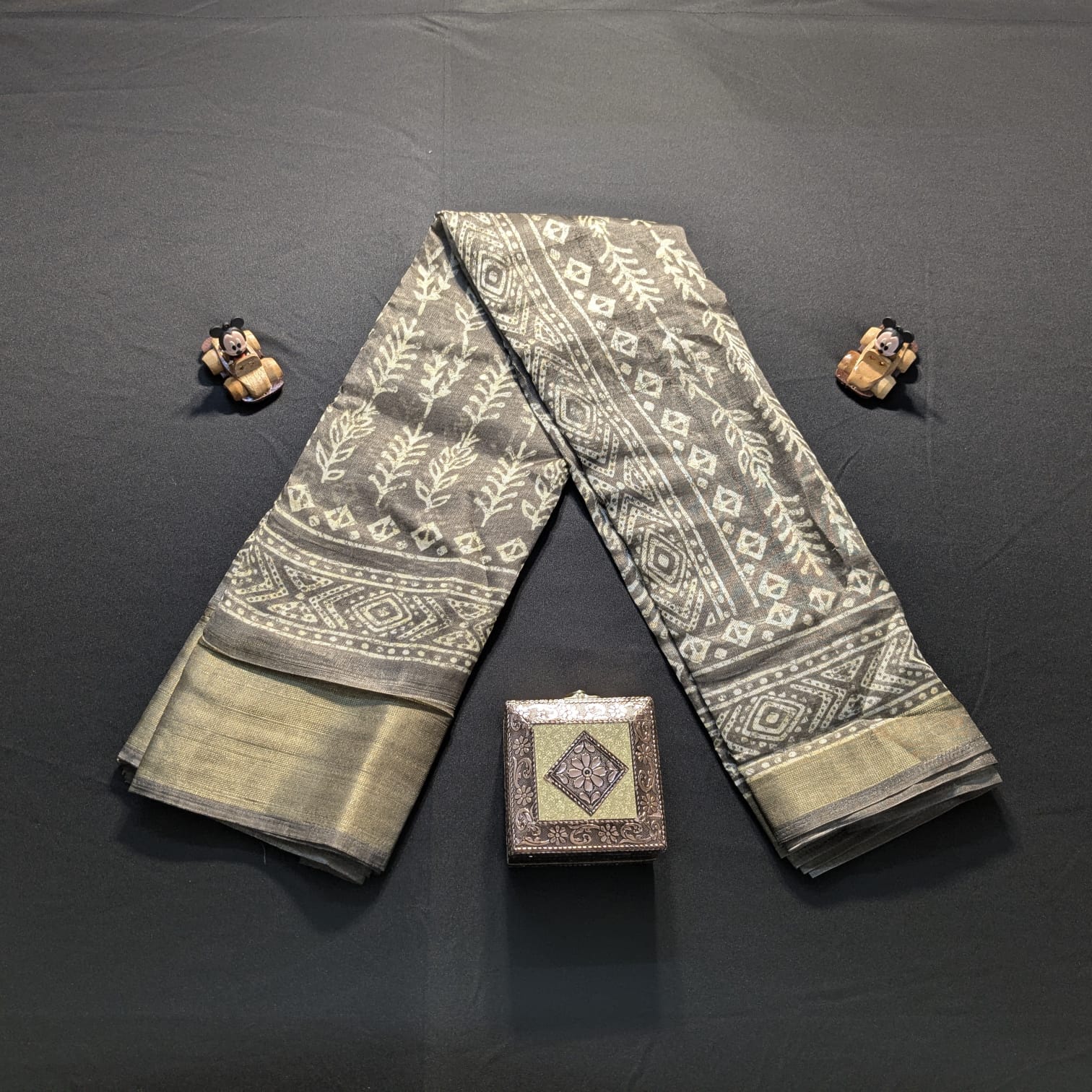 The attractive color palette adds a refined charm, while the intricate tree motifs lend a modern yet traditional appeal. The golden border enhances the saree’s elegance, making it suitable for both professional and festive occasions.