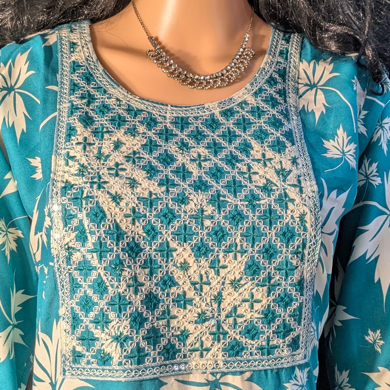 Enhanced with elegant tree prints, this kurti brings a nature-inspired charm to the soothing teal green shade. A functional side pocket adds everyday convenience without compromising on style. Finished with 3/4th sleeves, this kurti ensures comfort and season-friendly wear. Pair it effortlessly with leggings, churidars, or palazzos for a refined ethnic look.