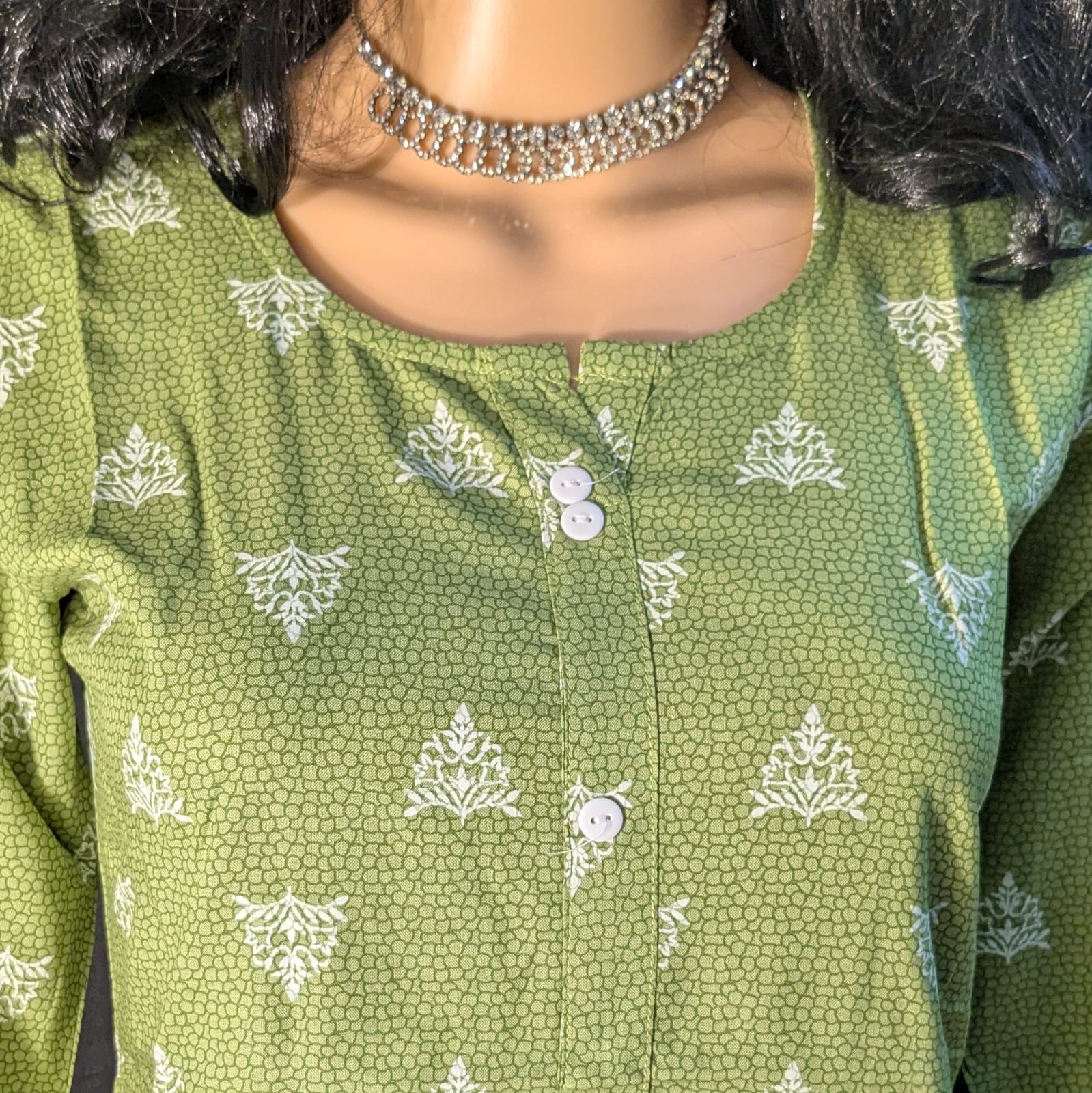 Bring effortless elegance to your wardrobe with this Green Capsule Model Straight-Cut Kurti adorned with white printed designs. Made from premium-quality fabric, this kurti ensures all-day comfort and durability while giving a stylish ethnic appeal. The simple neck design and 3/4th sleeves add a touch of modern charm, making it ideal for both work and casual wear. The soothing green shade with delicate white prints creates a graceful contrast that complements all skin tones. Pair it with jeans, leggings, or palazzos for a refined, chic look suitable for any occasion.