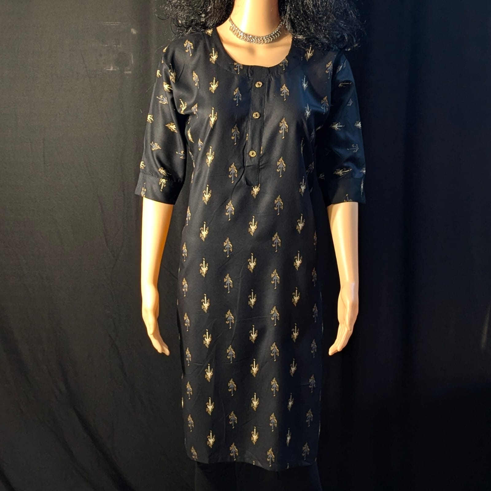 Adorned with subtle prints, this kurti brings understated elegance to your look without overwhelming the design. The 3/4th sleeves enhance comfort and provide a polished finish. Pair it effortlessly with leggings, palazzos, or straight pants to create a graceful and refined ethnic ensemble.