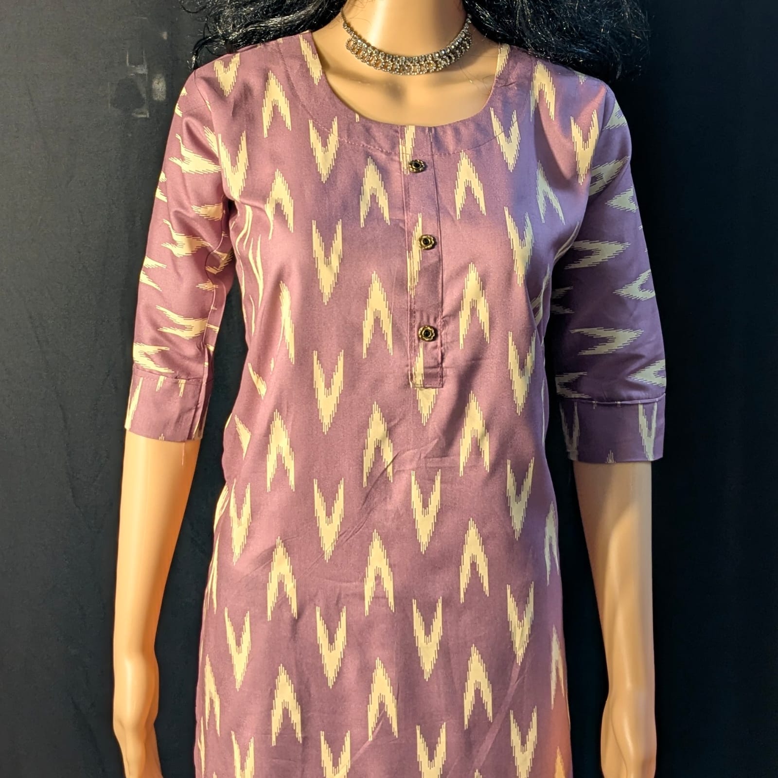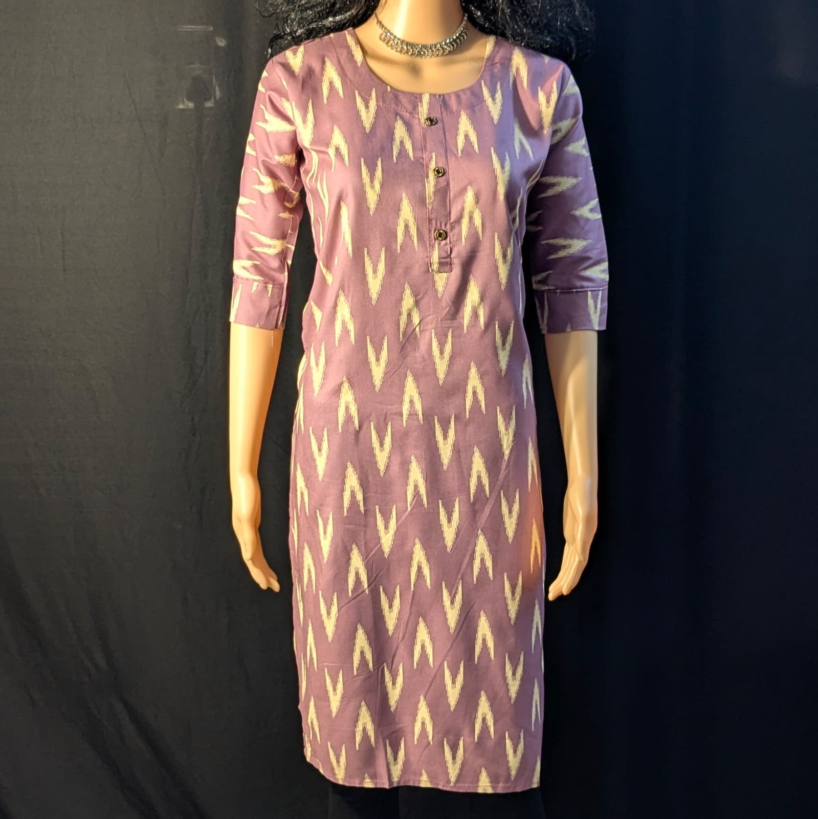 Adorned with delicate tree prints, the kurti brings a graceful ethnic charm inspired by nature. The soothing light purple shade paired with the elegant prints creates a balanced and stylish look. Finished with 3/4th sleeves, this kurti ensures comfort and versatility across seasons. Pair it effortlessly with leggings, straight pants, or palazzos for a refined and timeless ethnic ensemble.