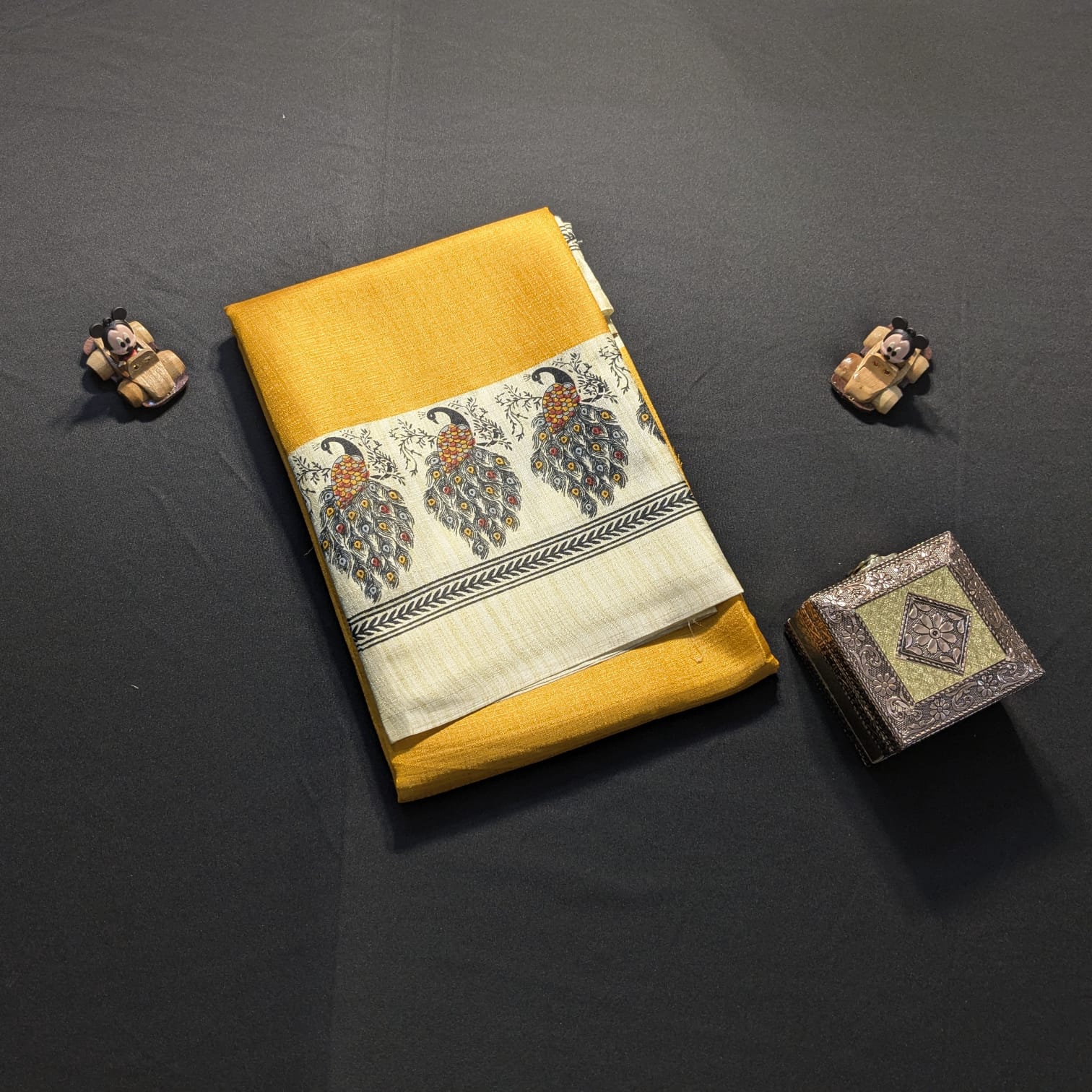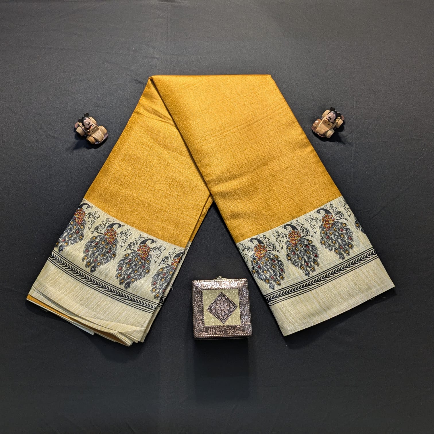 The vibrant yellow color adds a cheerful and graceful charm, while the intricate peacock motif along the border enhances its traditional appeal. This unique detailing makes it perfect for office wear, casual outings, festive gatherings, and cultural occasions.