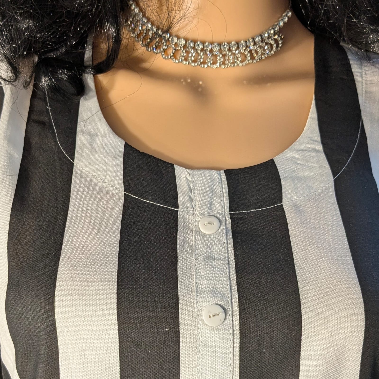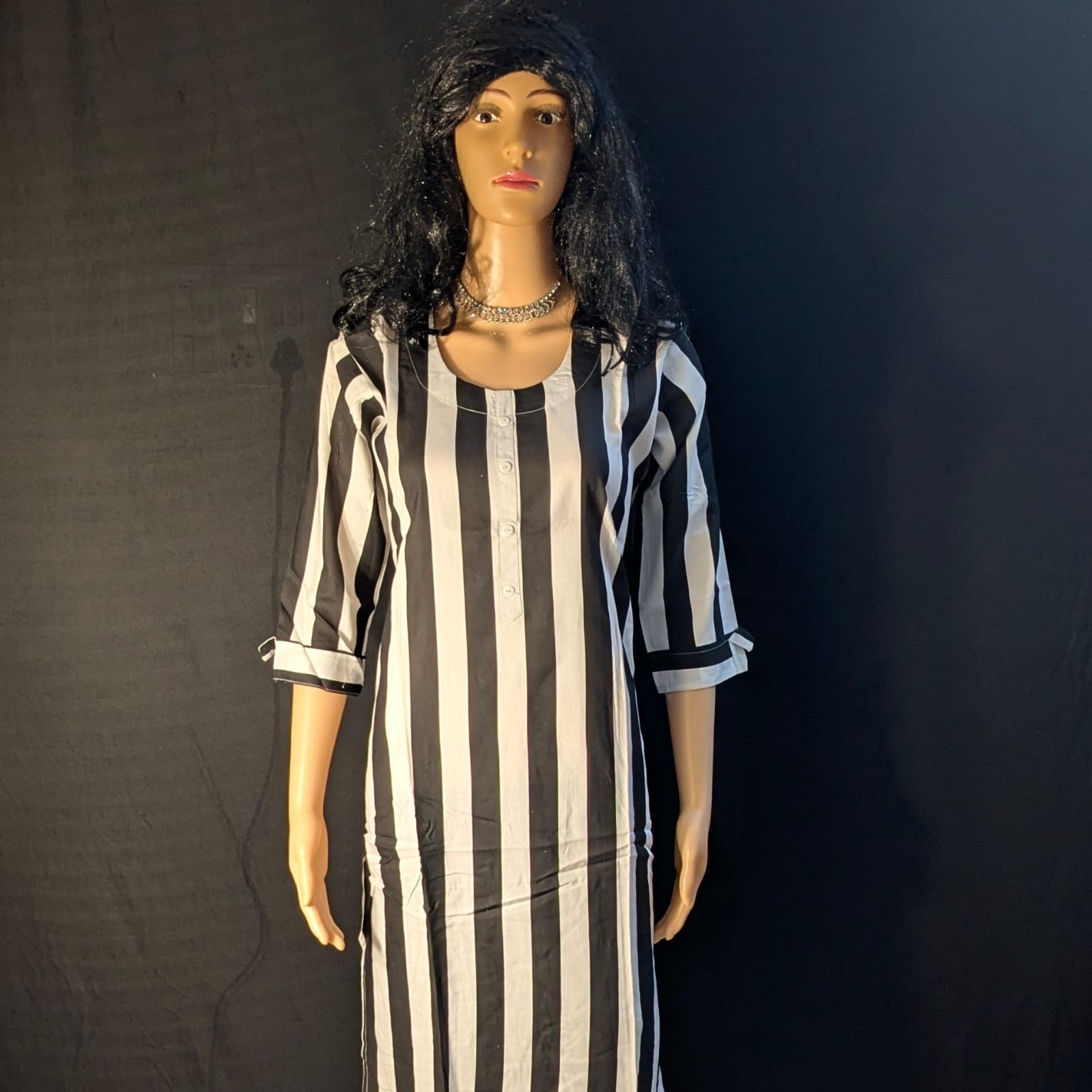 Add timeless elegance to your wardrobe with this Black and White Striped Capsule Model Straight-Cut Kurti. Crafted from premium-quality fabric, this kurti combines comfort with contemporary style. The vertical stripe pattern enhances your silhouette, giving a sleek and flattering look. Designed with a simple neckline and 3/4th sleeves, it offers a balanced blend of modern sophistication and everyday wearability. Perfect for both casual and formal occasions, this kurti pairs beautifully with jeans, leggings, or palazzos for a versatile ethnic look.