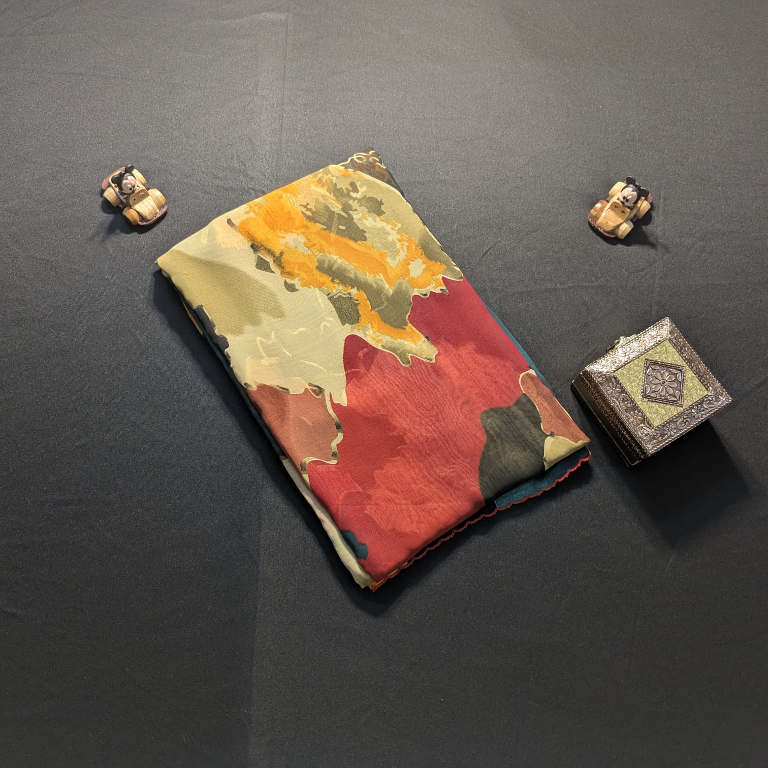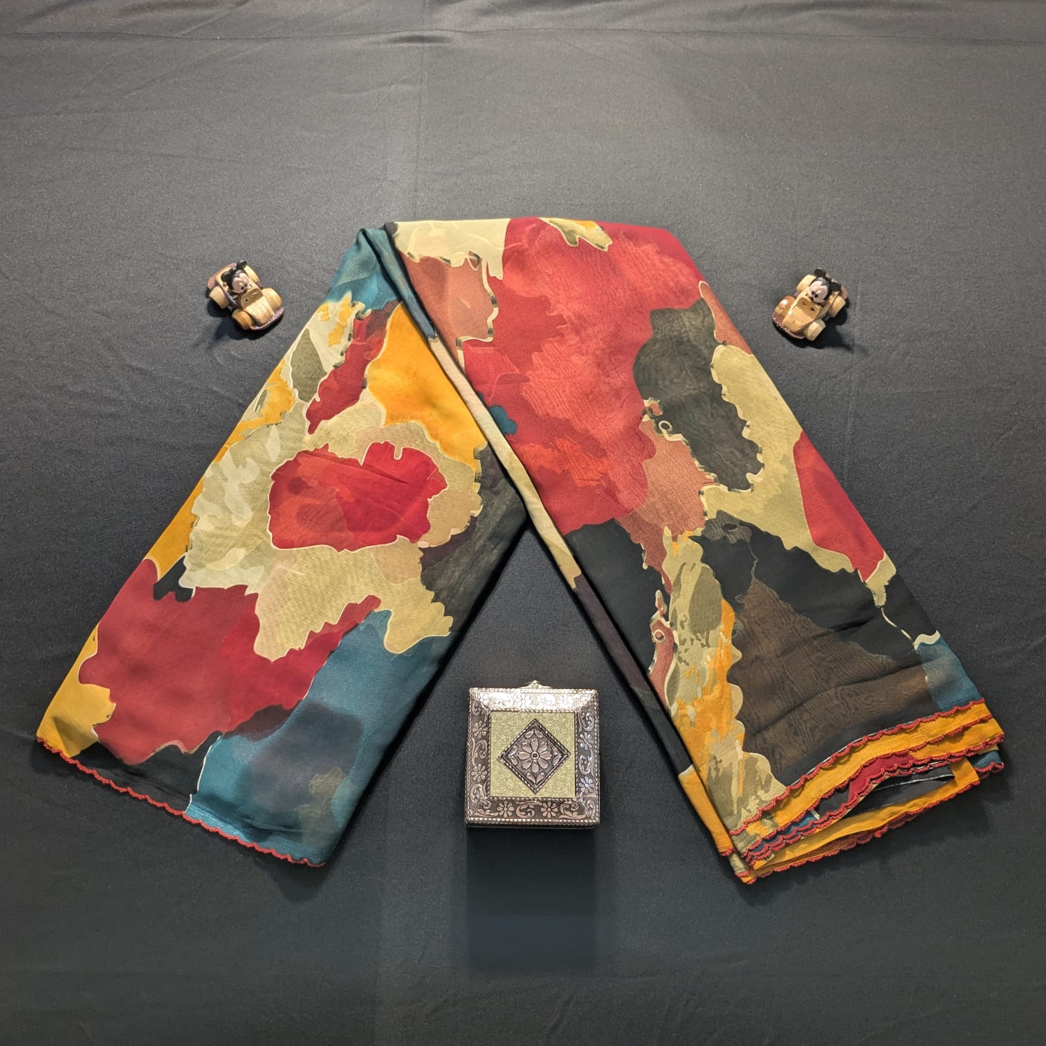 The bright multicolor design creates a cheerful and eye-catching look, blending contemporary style with traditional charm. This versatile saree can be styled effortlessly for both day and evening events, making it a must-have for any occasion.