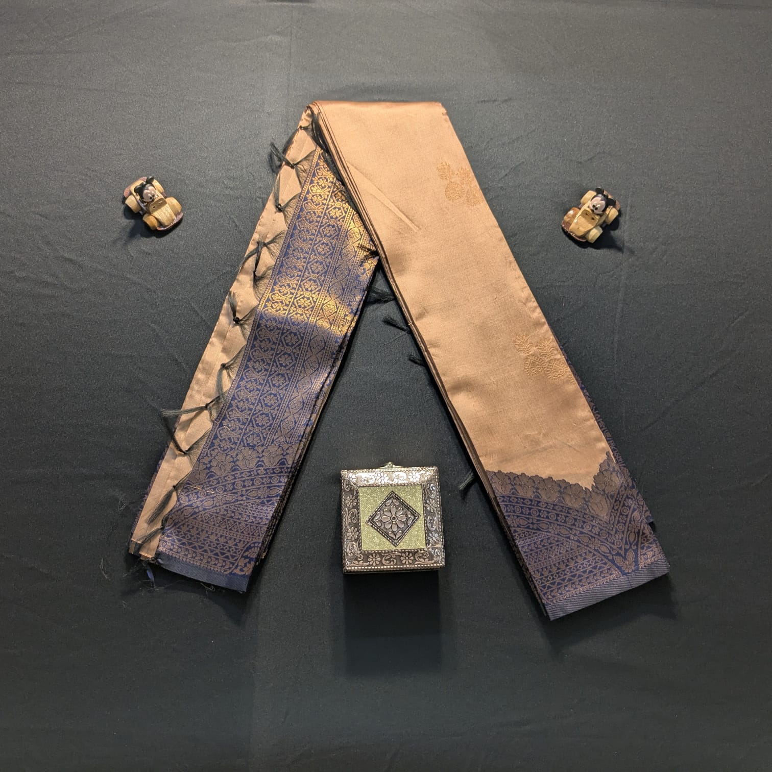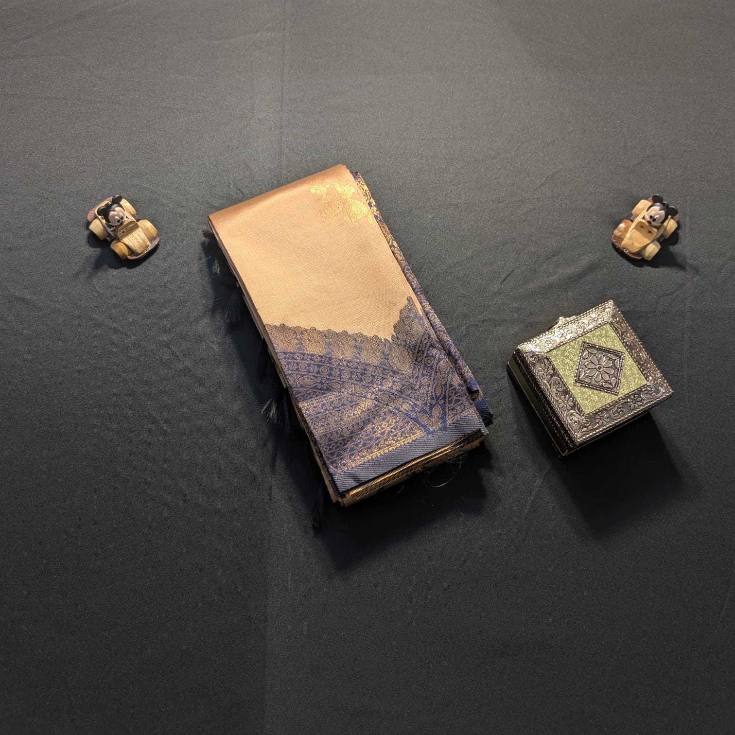 Step into elegance with this light peach silk saree, accentuated by a grand temple design on a contrasting blue border. Crafted from premium silk fabric, this saree offers a luxurious drape, smooth texture, and a rich, timeless appeal, making it perfect for weddings, festive occasions, and special celebrations.