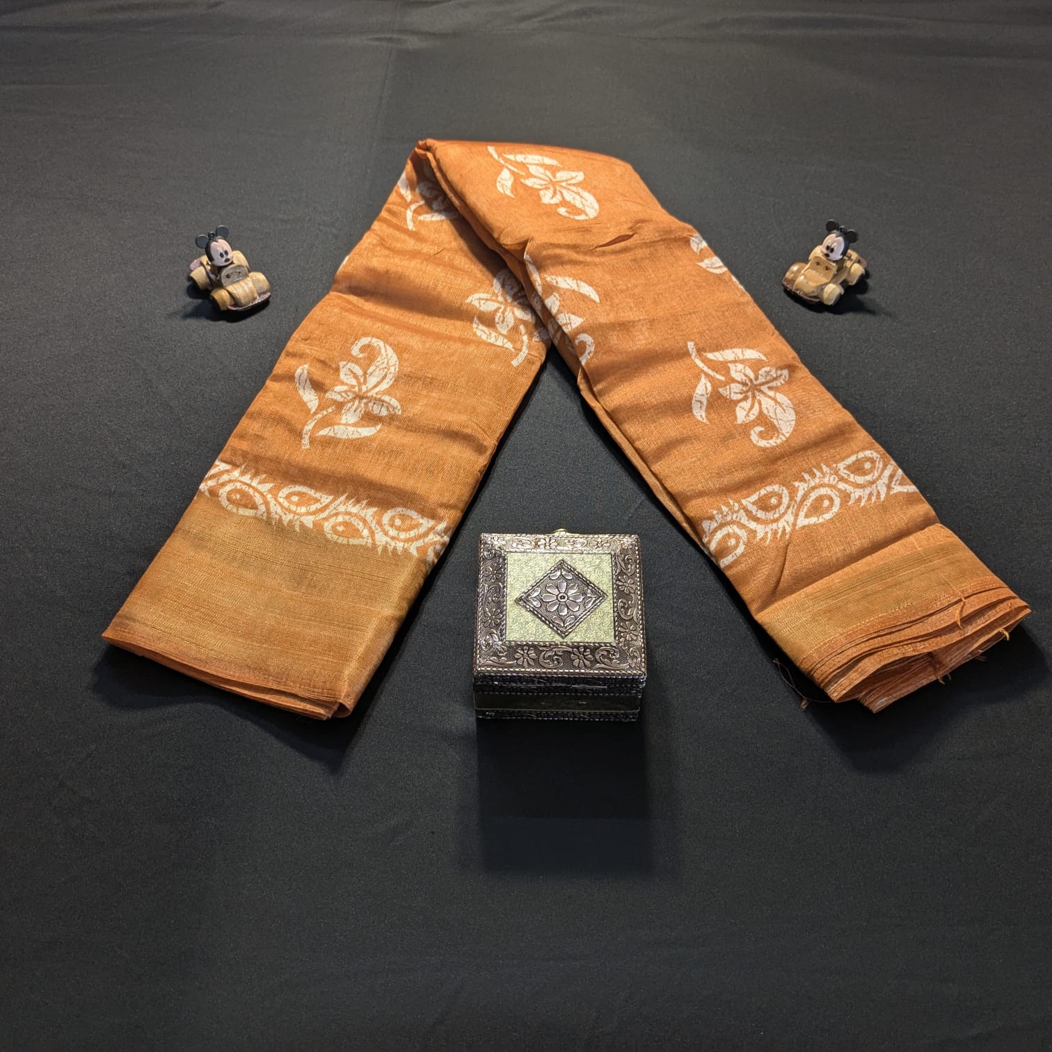 Add a touch of sophistication to your wardrobe with this vibrant jute saree, adorned with unique floral designs and a luxurious golden border. Crafted from premium quality jute fabric, this saree is lightweight, breathable, and comfortable, making it an ideal choice for office wear, casual outings, and semi-formal occasions.