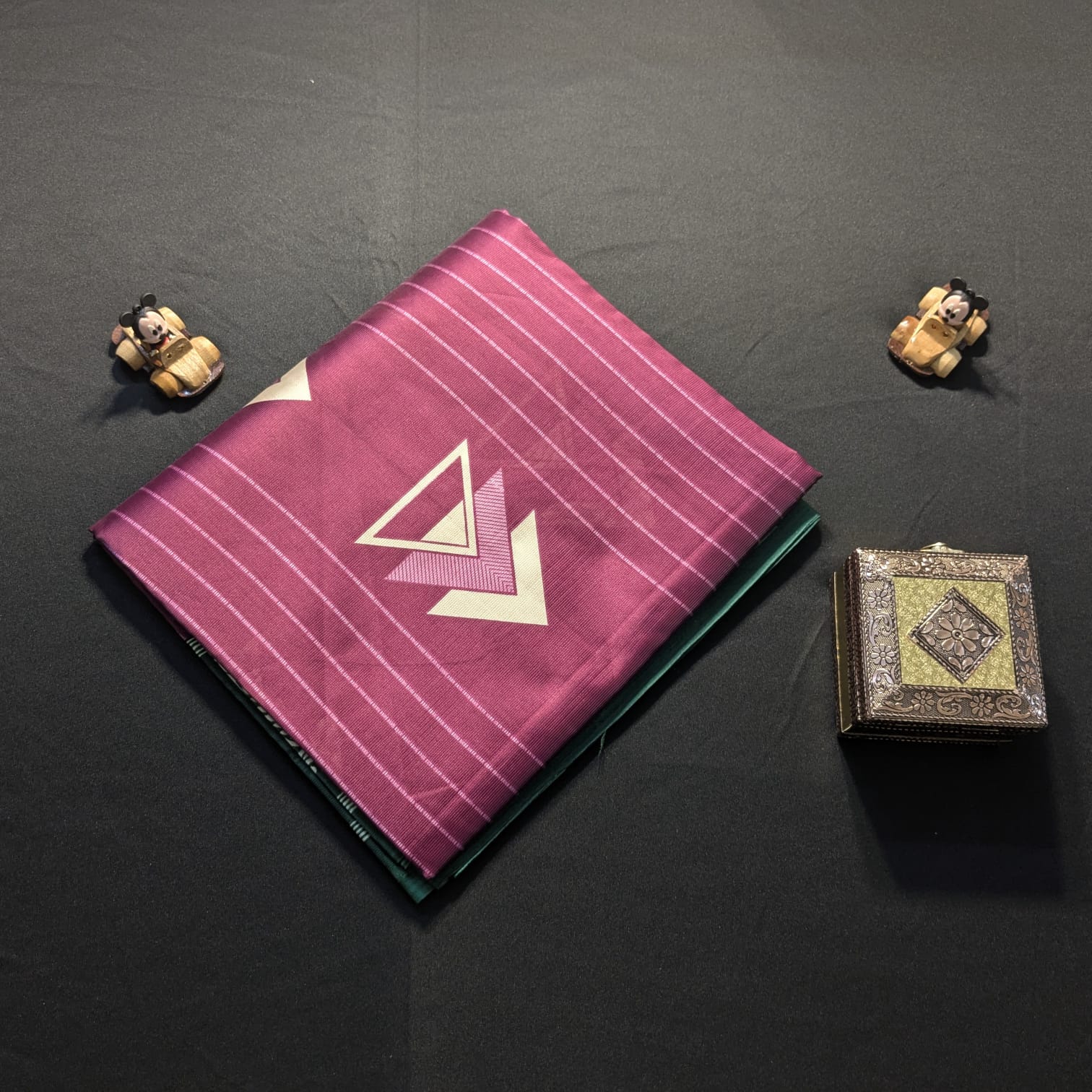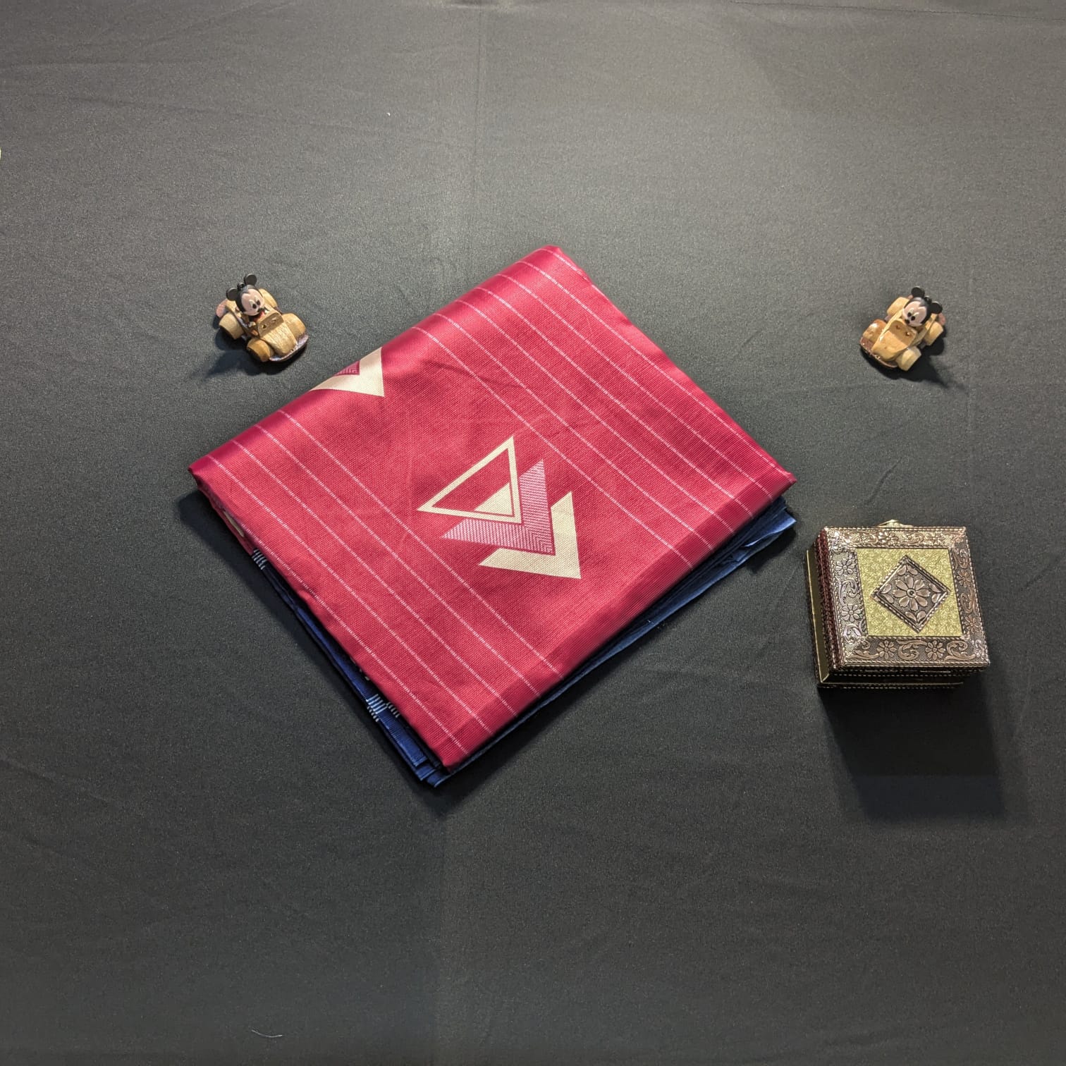 The vivid color palette enhances its contemporary appeal, while the geometric patterns bring a modern touch to traditional craftsmanship. The contrasting border adds a distinct, stylish accent, making the saree stand out at any gathering or event.