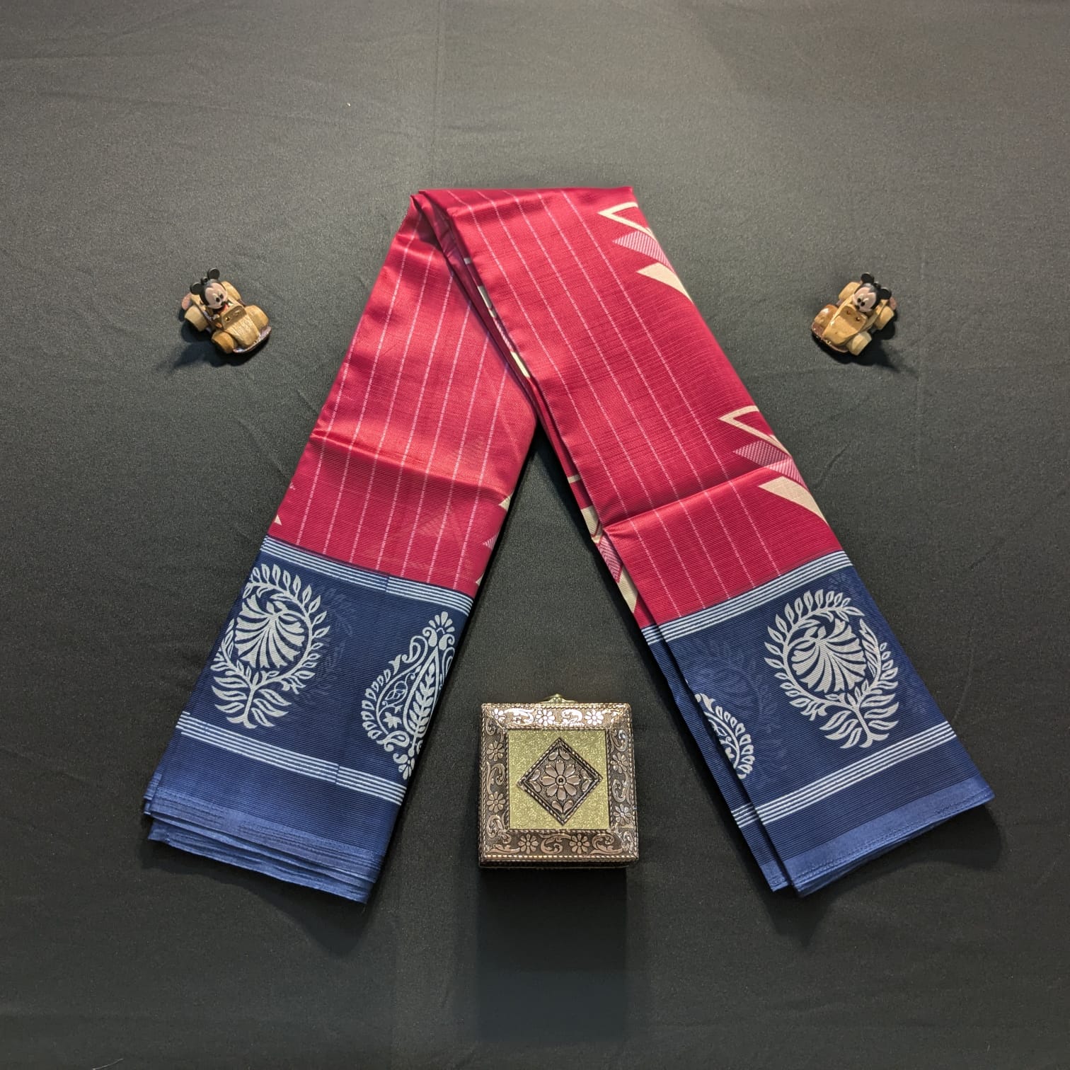 Add a pop of color and style to your wardrobe with this vibrant Nilgiri cotton saree, featuring bold geometric designs and a unique contrasting border. Crafted from premium Nilgiri cotton, this saree is lightweight, breathable, and comfortable, making it perfect for office wear, casual outings, and festive occasions.