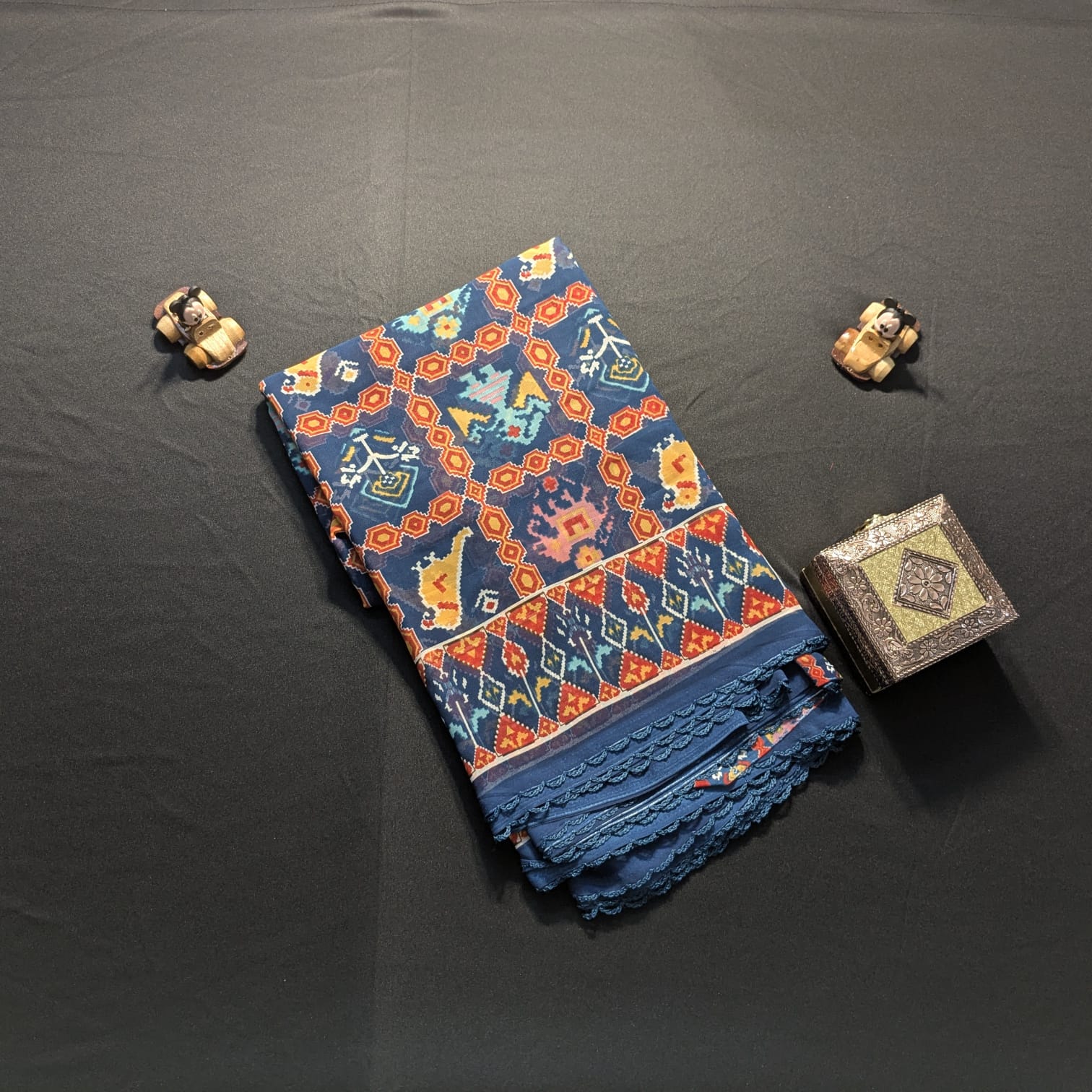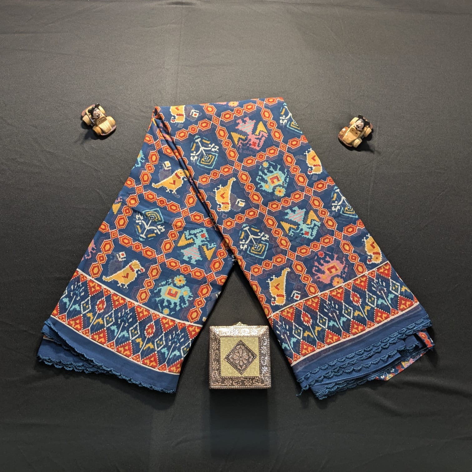 The deep blue color exudes sophistication, while the intricate unique patterns add a modern and stylish touch. Perfectly suited for office wear, casual outings, and festive occasions, this saree blends contemporary charm with timeless elegance.