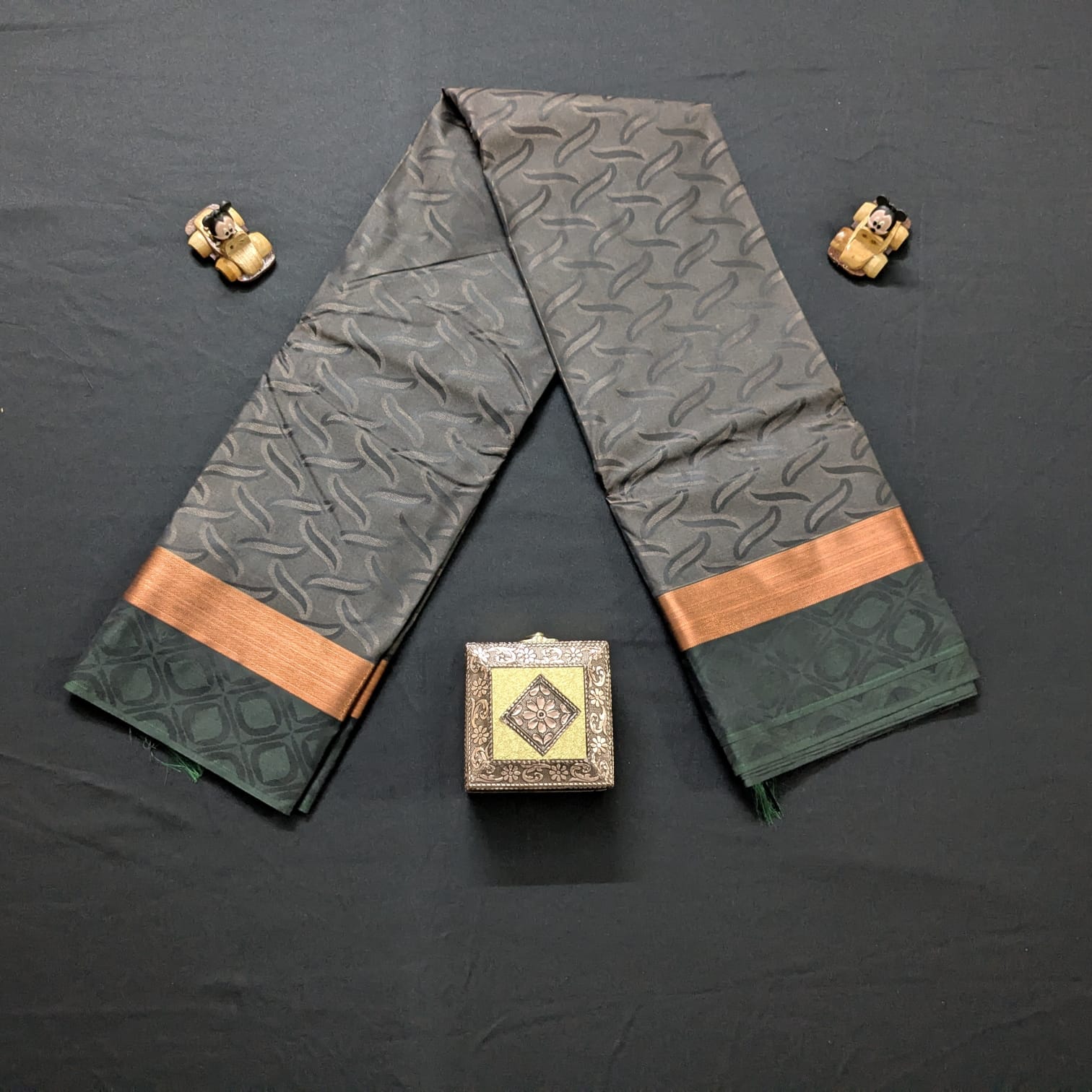 The neutral elephant shade provides a versatile base, while the green border adds a refreshing pop of color and a refined finish. Perfect for daily wear, office outings, casual gatherings, and semi-formal occasions, this saree combines simplicity with understated sophistication.